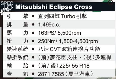 新車名既然用上經典跑車Eclipse之名,當然更著重動感操控。而大家要知道,Outlander搭載2.4L NA引擎的最大馬力及扭矩分別是168PS和220Nm,EclipseCross則採用最新1.5L渦輪增壓直噴引擎,除了更慳油,最高馬力亦有163匹, 1,800至4,500低中轉速更可綿密輸出250Nm扭力,比2.4L NA引擎多出30Nm;而匹配八前速無段變速波箱,還可於「Sport mode」時透過軚盤轉檔撥片加減轉波,滿足以高轉拖波的駕駛樂趣。懸掛方面就採用更顯韌性的前麥花臣支柱連防傾桿和後多連桿設計,引擎艙內更安裝有塔頂橫桿,以提升車架的橫向支撑力。