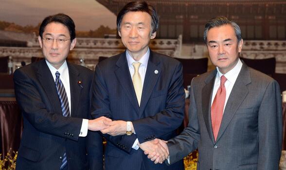 中日韓三國外長今日在東京召開會談,是相隔五年後,再度在日本召開。東道主日本外相岸田文雄,與中國外長王毅、韓國外長尹炳世,早上在東京舉行會談,除了為中日韓舉行首腦會談做準備,亦會討論推進中日韓自由貿易區,以及應對朝鮮導彈及核問題。據報,三人之後會召開聯合記者會,但不會發表共同聲明。岸田下午將會再與中韓外長分別舉行雙邊會談,王毅和尹炳世隨後亦可能禮節性拜訪首相安倍晉三。