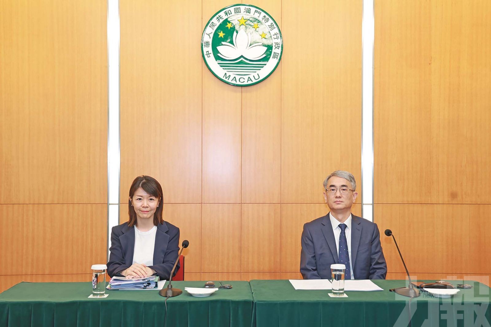 行政會發言人、行政法務司司長張永春及財政局副局長何燕梅介紹《修改〈2025 年財政年度預算案〉》法律草案。 (林嘉欣攝)