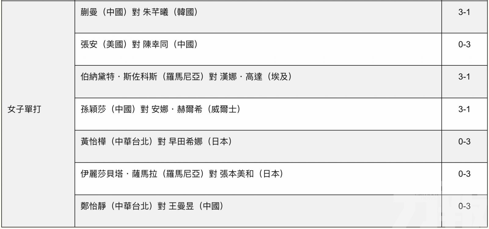第二日續進行的32強賽事,女子單打方面,孫穎莎對決威爾士安娜・赫爾希,雖曾一度被追平1:1,最終實力強橫的孫穎莎以局數3:1(11:7、10:12、11:3、11:4)勝出,而蒯曼同樣以局數3:1(6:11、11:8、11:6、11:7)擊敗韓國球手朱芊曦。至於陳幸同則以直落三局(11:1、11:8、11:6)輕鬆取勝美國張安。另外,王曼昱原定對陣中華台北鄭怡靜,由於鄭怡靜因傷退賽,王曼昱晉級女單16強。