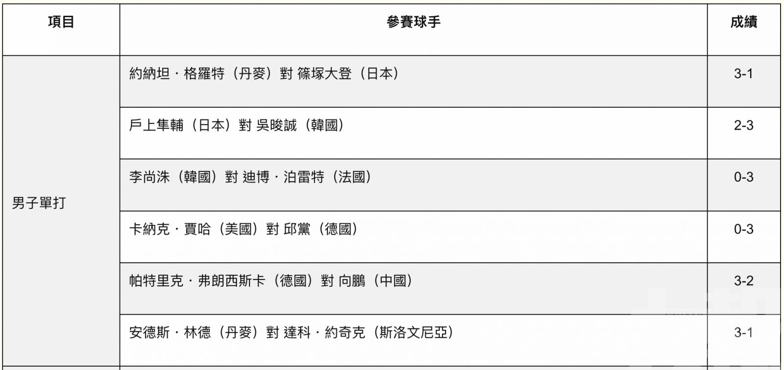 男子單打方面,中國向鵬迎戰德國帕特里克・弗朗西斯卡,雙方實力旗鼓相當,打足五局,最終向鵬以2:3(12:10、9:11、9:11、11:1、10:12)不敵帕特里克・弗朗西斯卡,無緣16強。而韓國吳晙誠對日本戶上隼輔遇到考驗,兩人平局2:2(15:13、2:11、15:13、9:11)後進入決勝局,最終吳晙誠在決勝一局以比分11:9取勝,晉級後下一輪將對陣賽事頭號種子林詩棟。另一場賽事,德國邱黨對陣美國卡納克・賈哈,邱黨以3:0(11:8、11:6、11:6)力壓卡納克・賈哈,順利晉級。