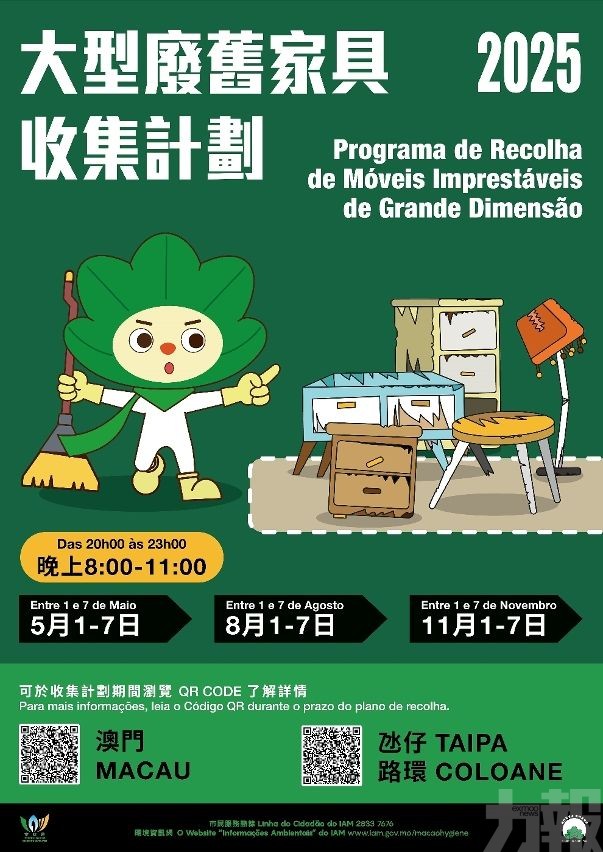 市政署將於11月1日至7日晚上8時至11時,在全澳多個地點設置臨時大型廢舊家具收集站。今年收集站數量由原有的60個增至136個,其中,澳門半島設有109個,氹仔及路環則分別設有16個及11個。
