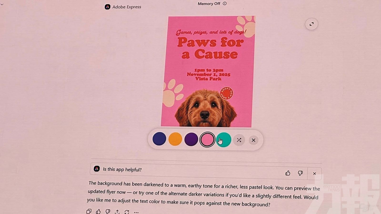 根據現場演示,未來使用者可在ChatGPT左下角的「更多」功能選單中直接啟動Photoshop或Adobe Express,透過自然語言與GPT對話進行即時影像編輯。例如輸入「幫我調亮背景」或「設計一張咖啡店傳單」,GPT 即可生成相應畫面,並支援以滑鼠點擊快速調整參數,一鍵匯出至 Adobe Express 進行進階修改。