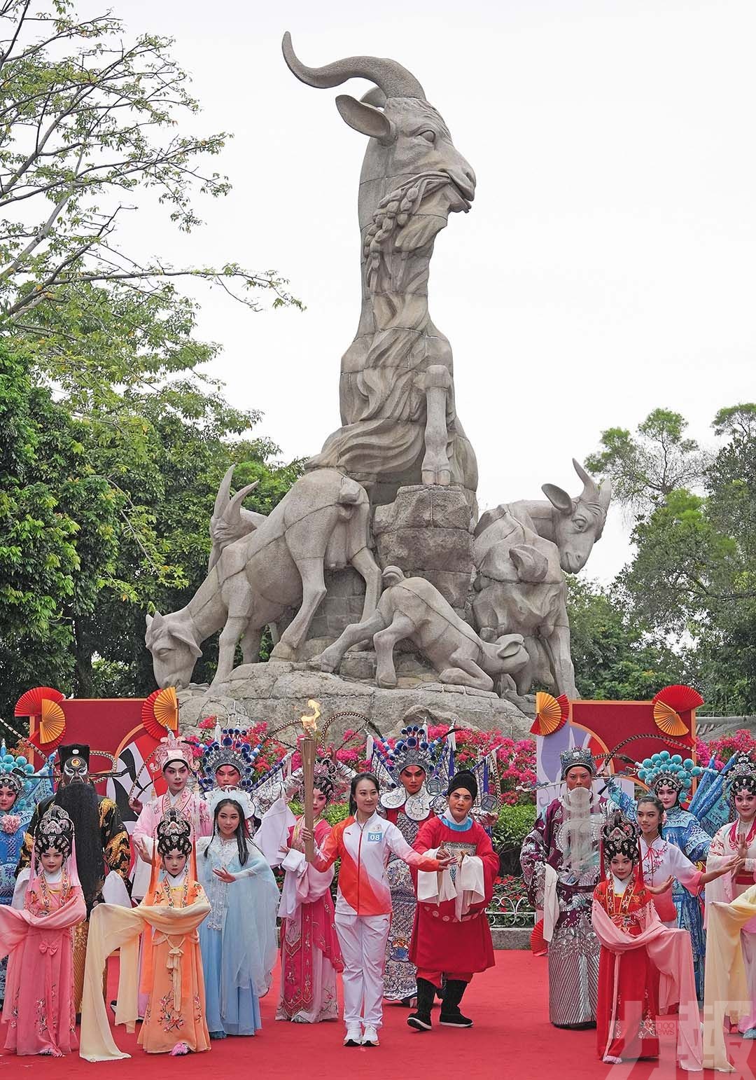 火炬手在廣州越秀公園內的五羊雕像前傳遞火炬。(新華社圖片)