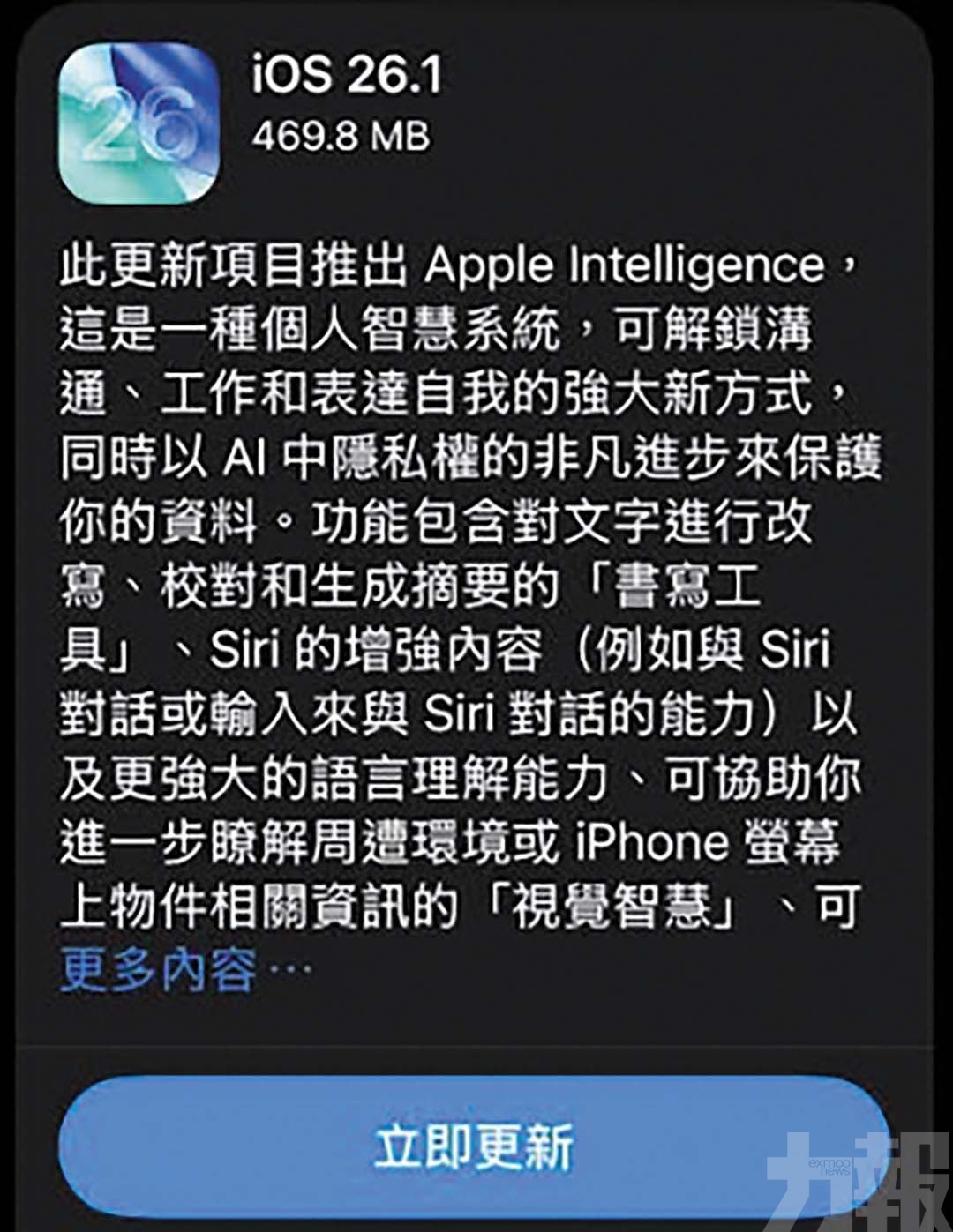 蘋果稍早正式釋出iOS 26.1更新,提供 Apple Intelligence繁體中文支援。(網絡圖片)