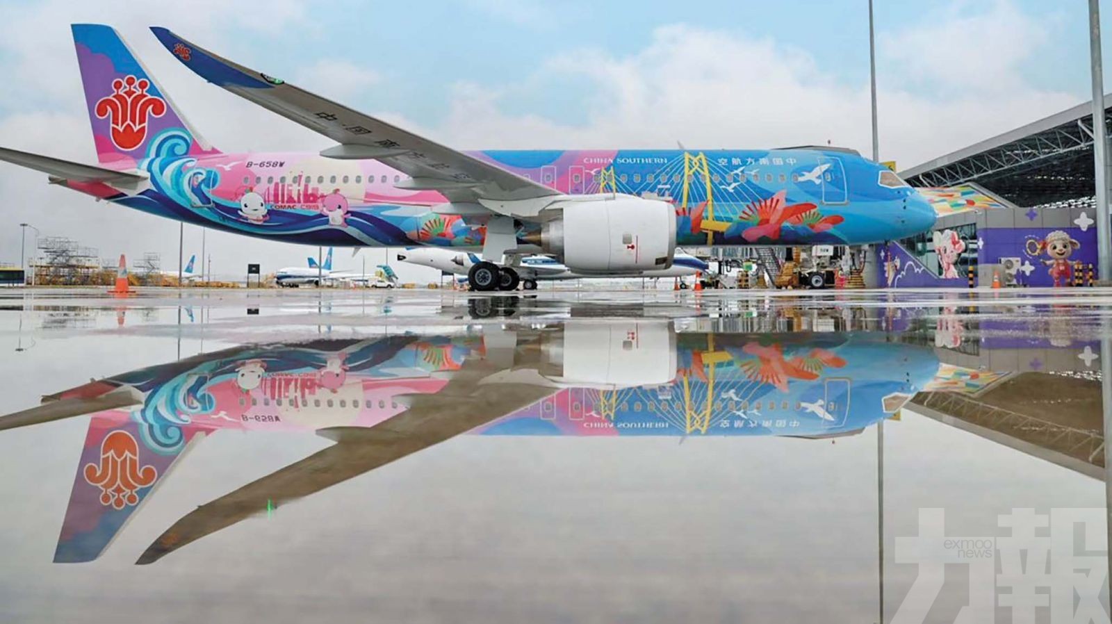 「大美灣區」號由南方航空運營,是首架融合C919國產客機 與 粵港澳大灣區 及 十五運會 主題設計的民航飛機。機身以藍、粉、黃三色為主調,結合「港珠澳大橋」、象徵嶺南文化的海洋元素與寓意「旭日東昇」的圖案,並搭配十五運會吉祥物「喜洋洋」與「樂融融」,展現灣區多元、開放與創新精神。