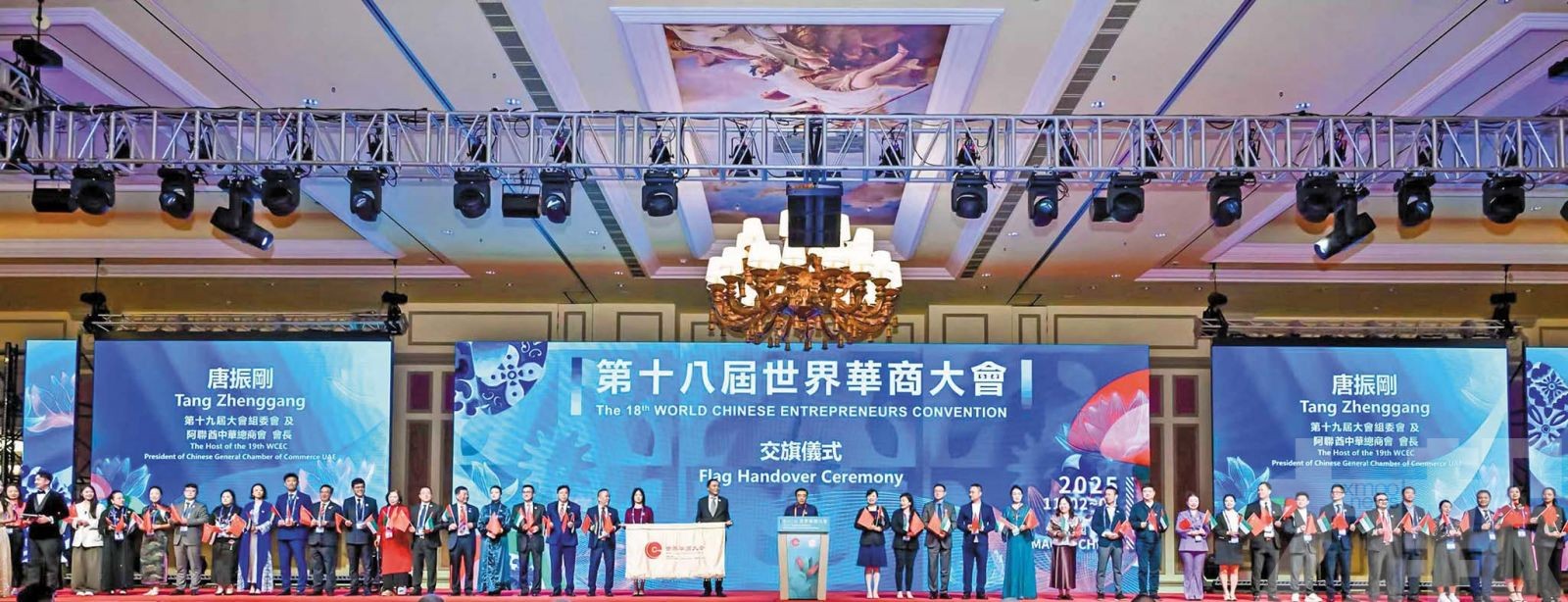 閉幕式及會旗交接儀式於4日下午六時半假威尼斯人宴會廳隆重舉行。會上,世界華商大會召集人組織正式宣布,下一屆大會將由阿聯酋中華工商總會接棒舉辦,標誌著全球華商網絡延伸至中東地區。