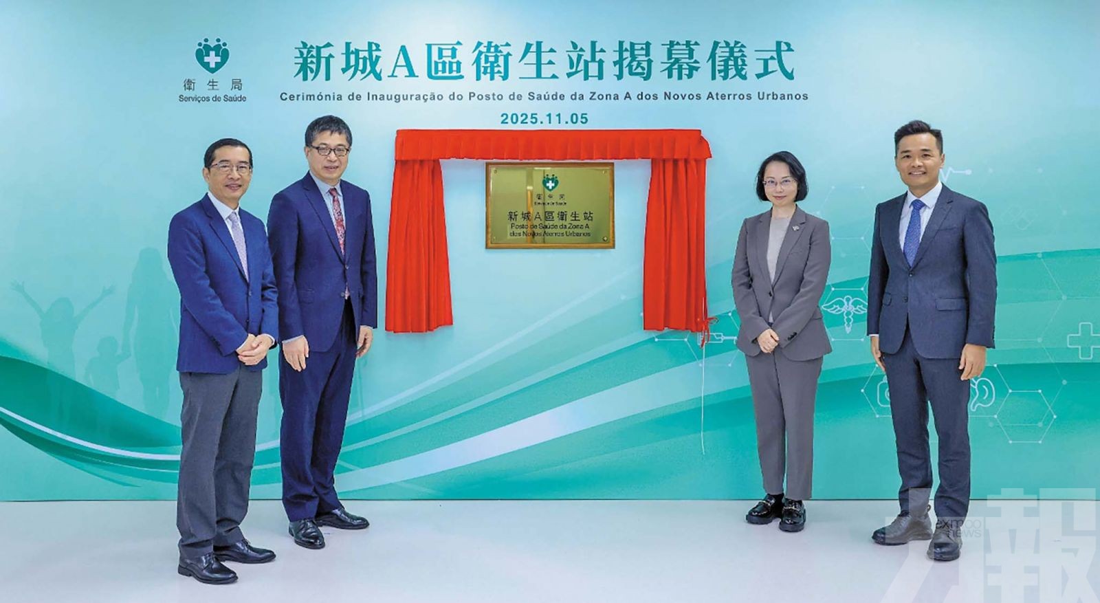 衛生局於昨(5)日舉行新城A區衛生站揭幕儀式,社會文化司司長柯嵐、中央人民政府駐澳門特別行政區聯絡辦公室宣傳文化部部長萬速成、衛生局局長羅奕龍、社會文化司司長辦公室顧問呂紅、衛生局副局長鄭成業、陳永華、代副局長戴華浩和中央人民政府駐澳門特別行政區聯絡辦公室宣傳文化部綜合處處長王惠杰等出席了儀式。在萬速成部長、羅奕龍局長和鄭成業副局長陪同下,柯嵐司長為衛生站進行揭牌,而衛生站將於今(6)日正式營運。