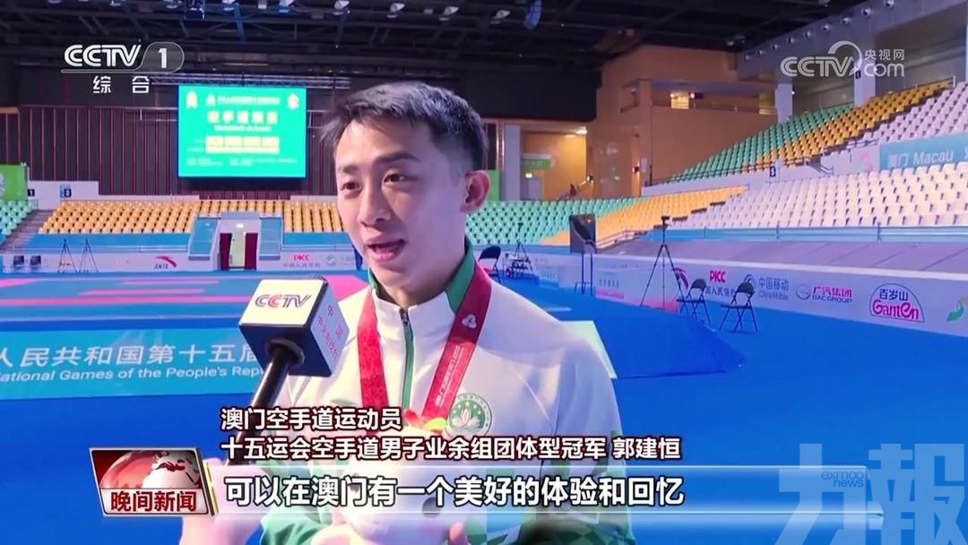 澳門空手道運動員 十五運會空手道男子業餘組團體型冠軍 郭建恆:可以在自己家門口參賽,我覺得很興奮,好開心可以拿到這個獎牌。祝所有來澳門參賽的運動員可以在澳門有一個美好的體驗和回憶,希望他們可以在比賽場上面發揮到自己的水準。