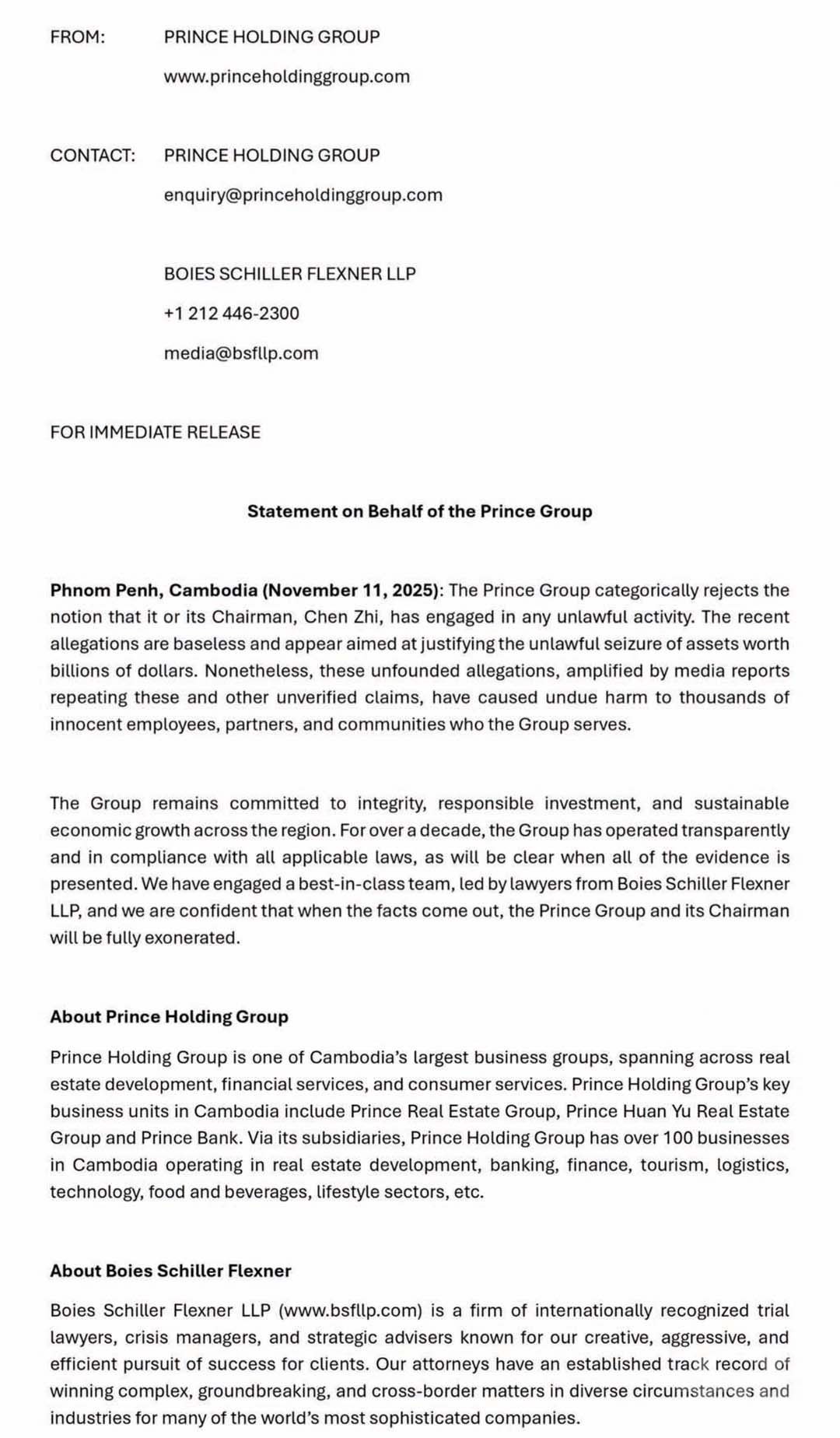 太子集團官網仍正常運作,聲明以中英文發布,指控美國司法部的起訴「毫無根據」,稱公司多年以來「合法經營、誠信發展」,並指資產遭「非法扣押」,相關報導對旗下上萬名員工與合作夥伴造成嚴重影響。集團聲稱,將以法律途徑證明清白,維護公司與董事長名譽。