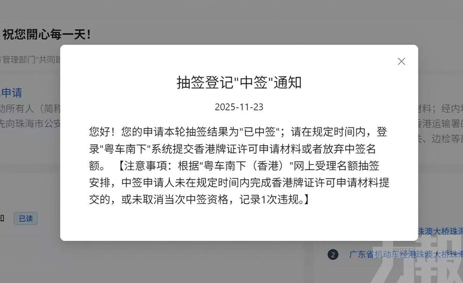 根據安排,中籤者可自12月9 日上午 9 時起,按照系統指引辦理相關手續,包括提交資料及完成審批。通過審批的車輛將可自 12 月 23 日零時起 按規定駛入香港市區。