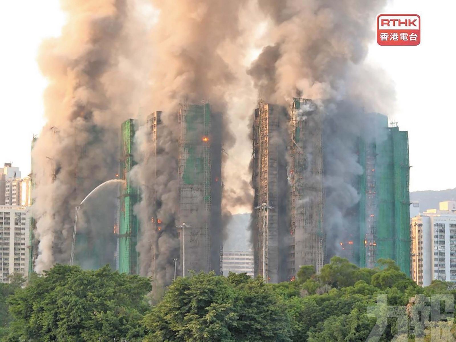 竹制棚架和尼龍防護網等易燃材料加劇了火勢,大火迅速蔓延至多座樓宇。 (香港電台圖片)