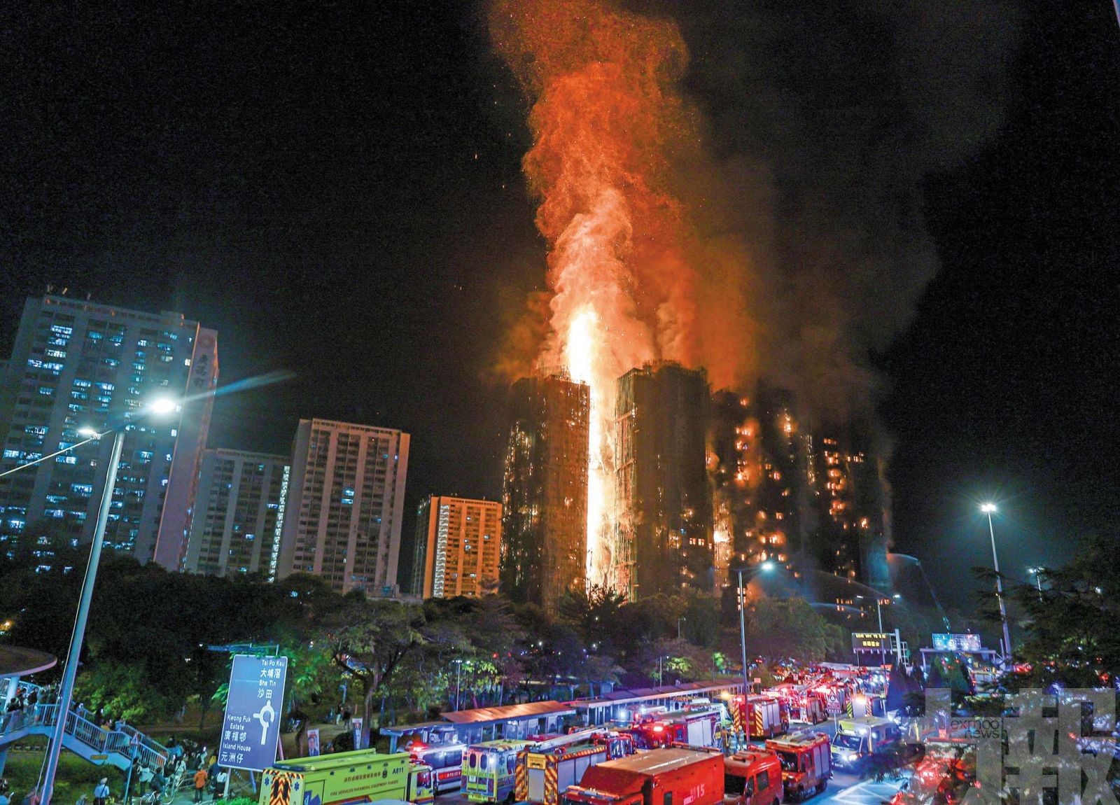 儘管消防努力救火,大火從下午燒到入夜。消防處副處長陳慶勇昨晚在簡報會上說,入夜火勢已蔓延至屋苑七座大廈。消防一共派出八條水龍、七條鋼梯及22隊搜索隊,以及128輛消防車、57輛救護車,並有合共767位消防及救護人員,已處理28名傷者,其中九位現場死亡,另有六人嚴重,其中四人送院後證實死亡。