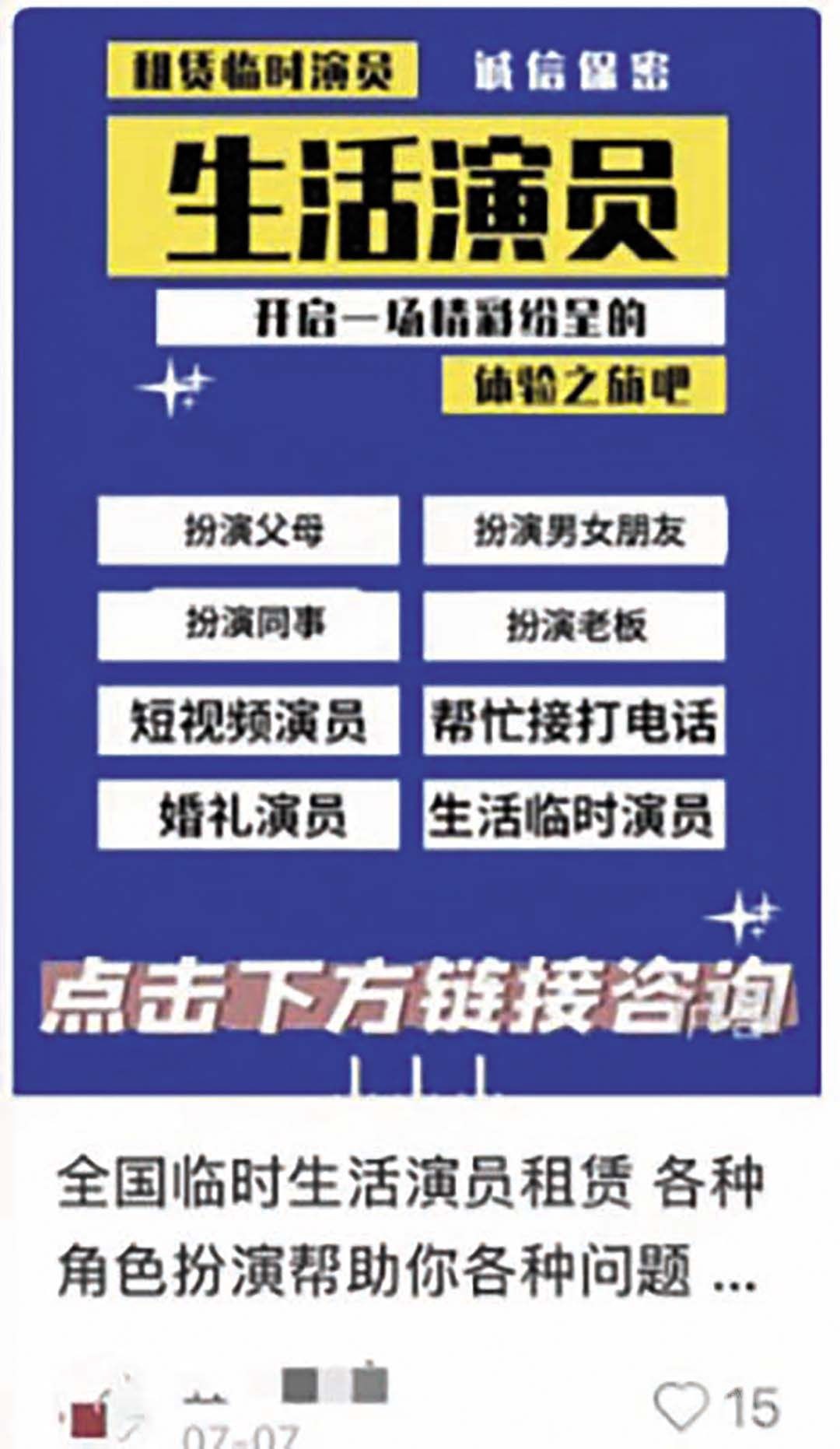 內地社交平台近日出現大量提供「扮演父母」服務的廣告,聲稱可按客戶需求,在見家長、社交聚會或情感場合中「專業出演」爸媽或親友,並以「演技精湛、值得信賴」作為宣傳賣點,甚至有經紀人稱「見對象穩過倪大紅」,引發社會關注。
