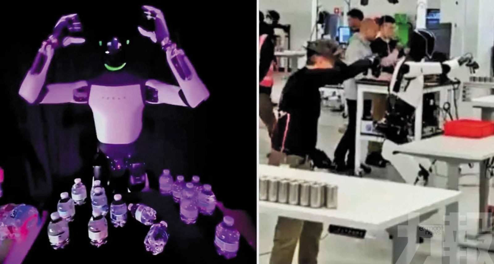 畫面顯示,Optimus在派發瓶裝水過程中動作失誤,多瓶水掉落地面,隨後機器人失去平衡向後跌倒。而最引人關注的瞬間,則發生於倒地前的短短一秒鐘——其雙手突然抬至面部,並做出抓握動作,彷彿正在摘下一個實際並不存在的裝置,如同摘下虛擬實境(VR)頭顯。