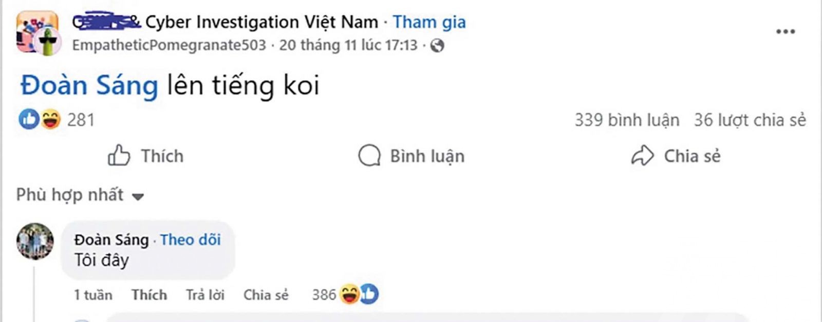 由於官方調查初期未有公開進展,部分網民遂自發成立「越南網路調查社群」臉書群組,蒐集與比對影像畫面、社群帳號、紋身細節及地理線索,進行民間追查。經過數月整理,該社群於11月底完成一份調查報告,指認嫌疑人為57歲男子段文生( Đoàn Văn Sang),其任職於越南諒山省市場管理單位,並推測犯案地點位於市場管理隊第四隊舊址。