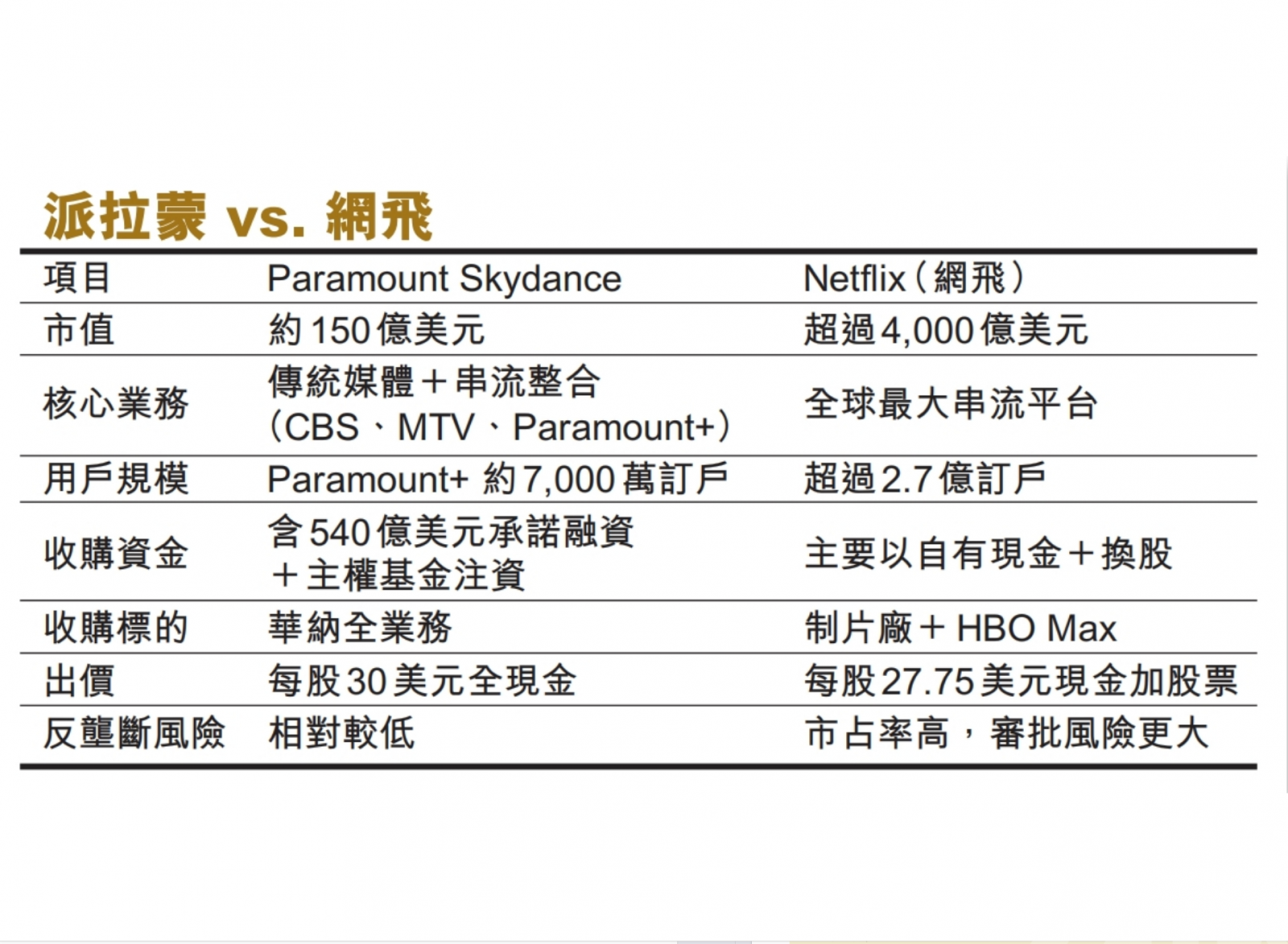 派拉蒙強調,其全現金收購方案相較網飛的「現金加換股」結構,將為股東額外帶來約180億美元現金價值。此外,派拉蒙亦指出,其交易規模與市場集中度相較網飛更低,更有利於爭取反壟斷機構放行。