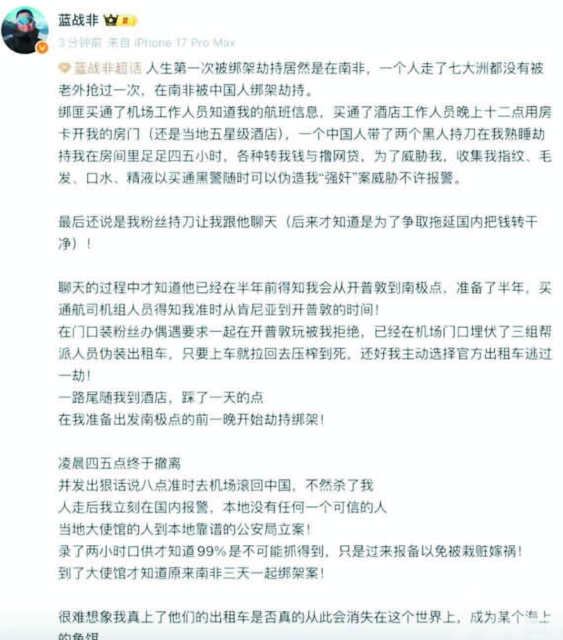 擁有逾2,400萬粉絲的中國知名旅遊博主及遊戲主播「藍戰非」周二(9日)在社交平台發文,自述日前於南非開普敦入住一間五星級酒店期間,遭三名匪徒持刀闖入房間劫持禁錮,事件持續約四至五小時。其貼文描述,匪徒疑似提前策劃行動長達半年,並買通機場及酒店內部人員以掌握其行程,原計畫在機場動手,因其臨時搭乘官方的士而未能得逞,最終轉而在酒店對其實施挾持。