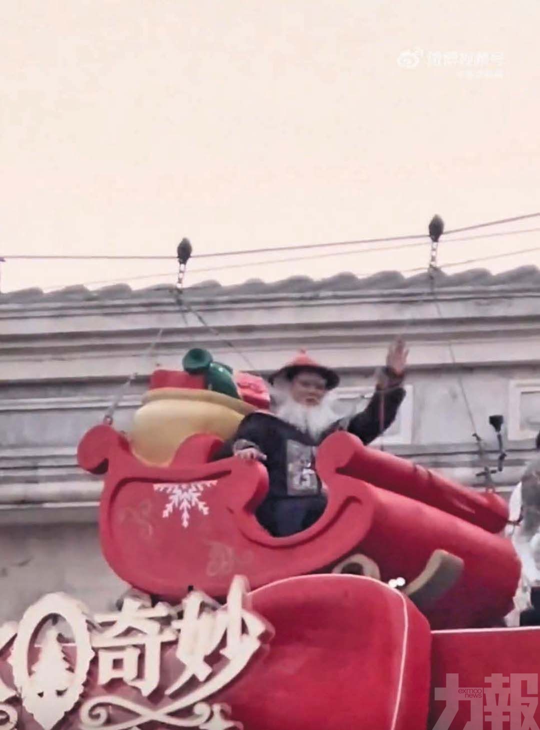 上周六(7日),相關影片在社交平台廣泛流傳。片中,一名工作人員身穿周星馳電影《鹿鼎記》中由徐錦江飾演的經典角色「鰲拜」造型,戴上紅帽、乘坐鹿車於空中緩緩滑行,沿途向遊客揮手。夜幕降臨後,景區播放聖誕歌曲,手持煙花的「鰲拜」繼續巡遊,現場瀰漫濃厚節日氣氛。