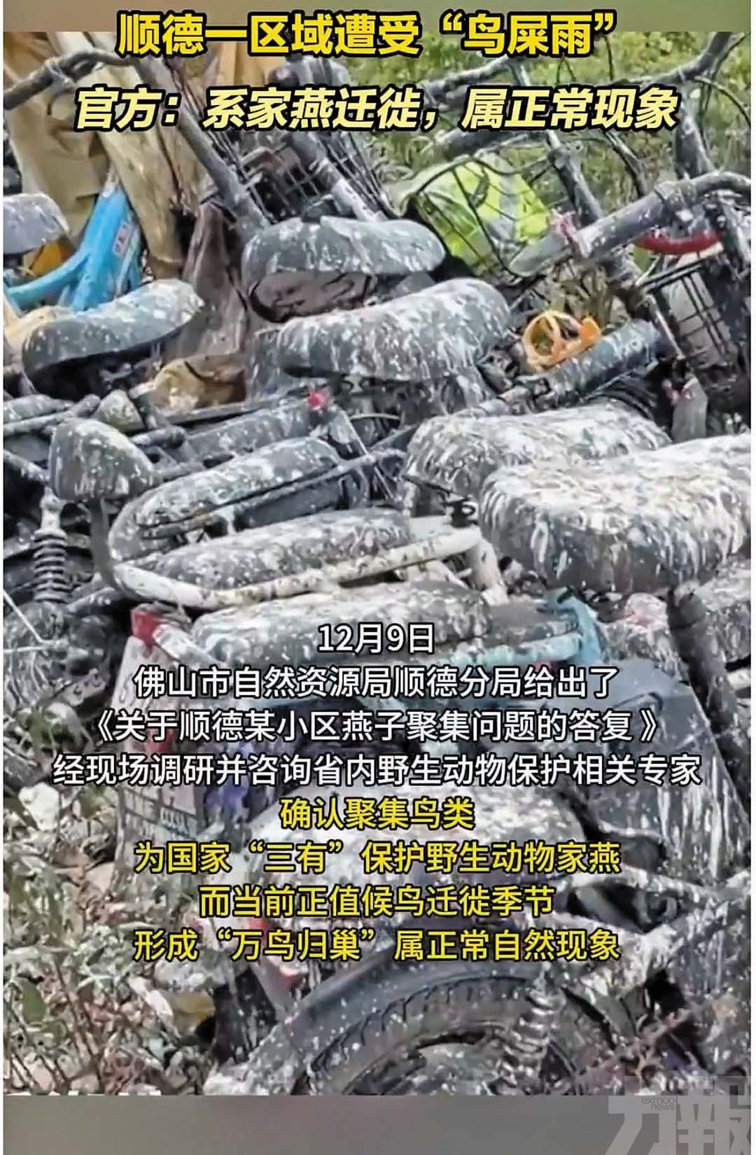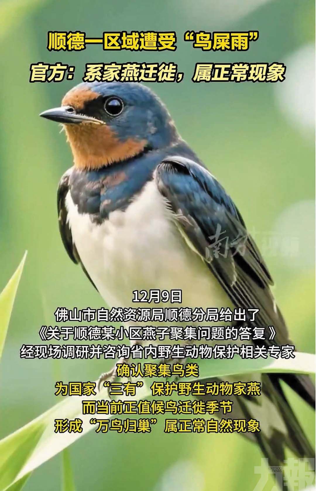 針對相關情況,佛山市自然資源局順德分局於12月9日發表《關於順德某小區燕子聚集問題的答覆》。經現場調查並諮詢省內野生動物保護專家,確認聚集鳥類為國家列明的「三有」保護野生動物──家燕。當局指出,現正值候鳥南遷或換棲的季節性遷徙時期,形成短暫「萬鳥歸巢」或群鳥夜棲的現象屬自然生態行為,在順德其他鎮街乃至省內多地亦時有出現,並非個別或異常事件。