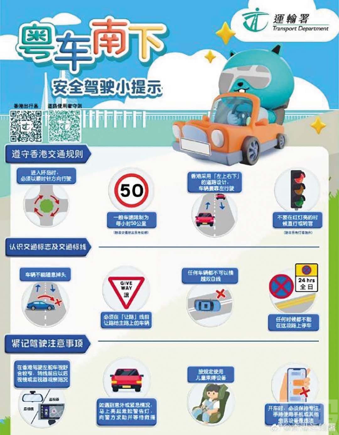 港府發片提示「 粵車南下 」交通規則注意事項。 (網絡圖片)