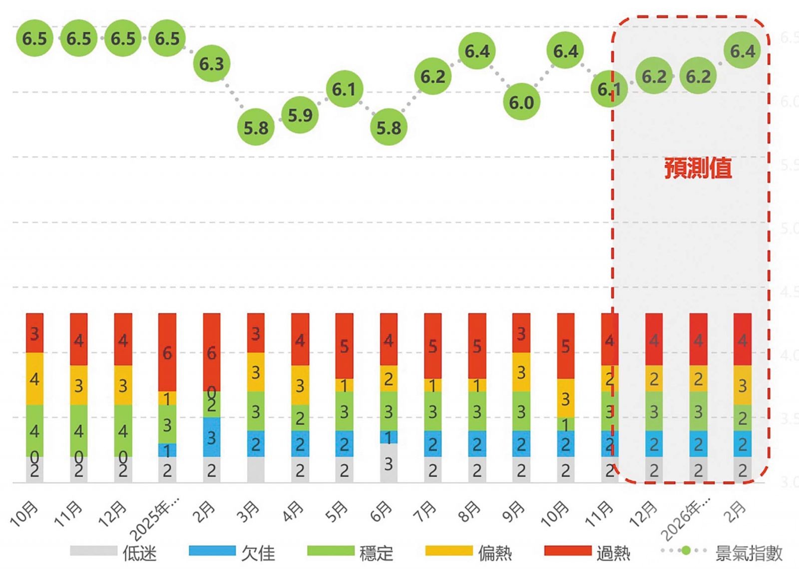 澳門經濟學會昨(15)日發布最新澳門經濟景氣指數走勢。當中指出,10月受「黃金周」帶動,本澳綜合旅遊休閒相關的主要指標:入境旅客、酒店住客與入住率皆進入「偏熱」或「過熱」區間;博彩毛收入保持穩中向好,10月、11月的日均博彩毛收入升至7.77及7.03億澳門元,帶動整體服務業的節奏明顯加快;總就業人數持續攀升,失業率進一步降至1.7%,屬「低失業率」等級。與此形成對比的是,反映市場預期與投資意願的領先指標仍未同步升溫。本地居民貸存比持續向下。六大休企股價在「欠佳」區間徘徊,反映資本市場對仍抱持審慎態度;而住宅樓價指數延續低迷。經綜合指標數據的分析及推算,10月至11月的經濟景氣指數整體維持在「穩定」等級。