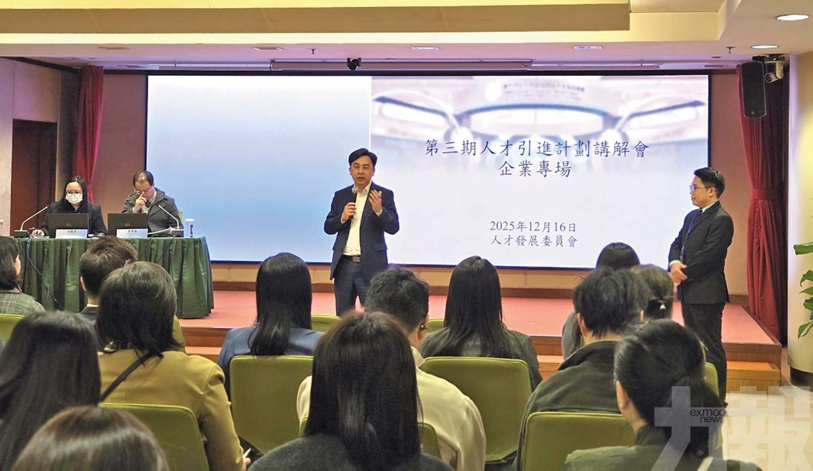 為了讓有意申請人士進一步了解計劃詳情及申請手續,人才發展委員會(下稱“人才委”)於2025年12月16日舉行首場“澳門特區第三期人才引進計劃講解會”,是次講解會為企業專場,共邀請了本澳高等院校,以及澳門和橫琴合作區重點產業相關的50個企業和機構之代表出席,現場同步設有線上會議。會上重點介紹第三期人才引進計劃的申請手續、申請所需文件和注意事項,包括申請人可透過已升級功能的電子申請平台,清楚了解需要提交的文件,以提升申請文件的準確度;同時,由於審批流程已簡化並全面電子化,申請人亦可隨時透過平台掌握申請進度。