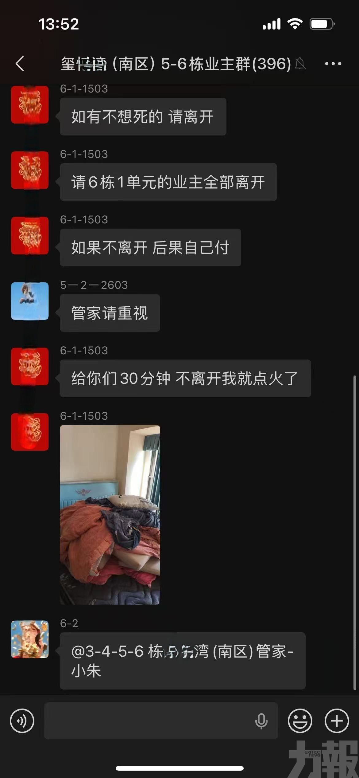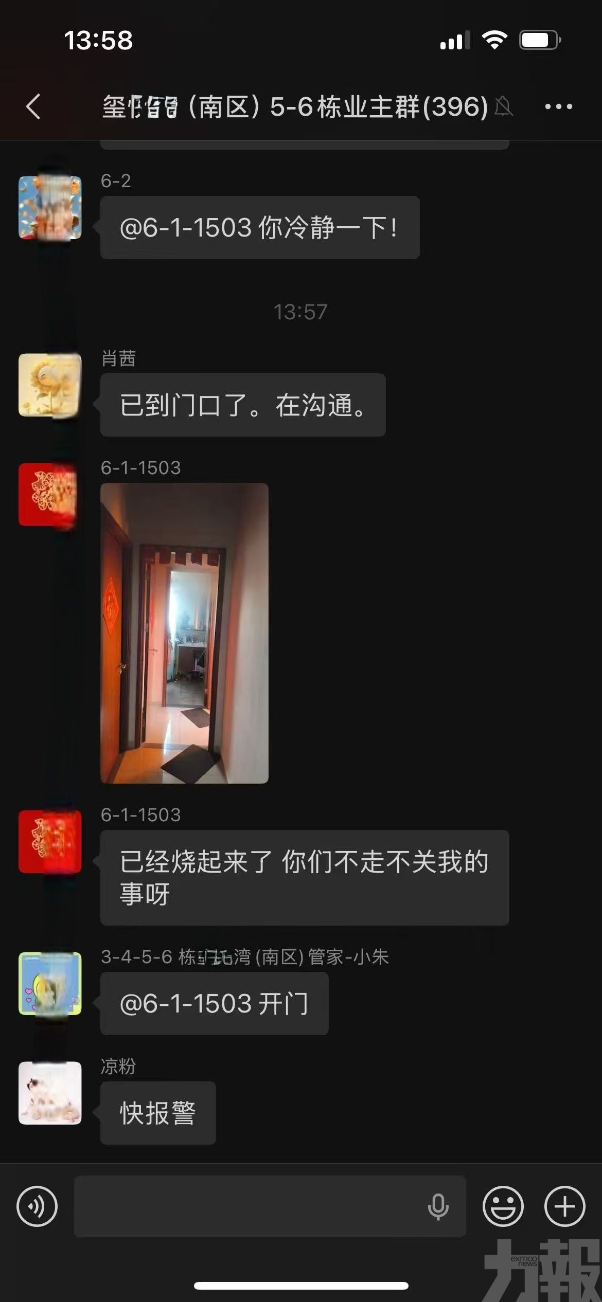 網上流傳多則疑似起火單位業主在業主群的對話記錄,顯示有人故意放火燒屋,要其他業主迅速離開。但相關消息未經警方或當地消防部門證實。