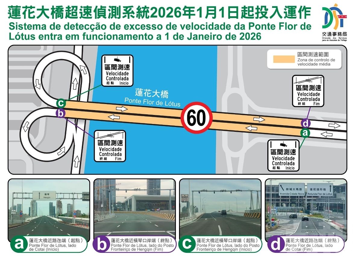 為保障道路使用者的安全,經交通高等委員會審議通過,及經交通事務局與治安警察局協調,蓮花大橋新增定點超速偵測系統及區間超速偵測系統,將於2026年1月1日(周四)凌晨零時起投入運作,以打擊超速違規行為。