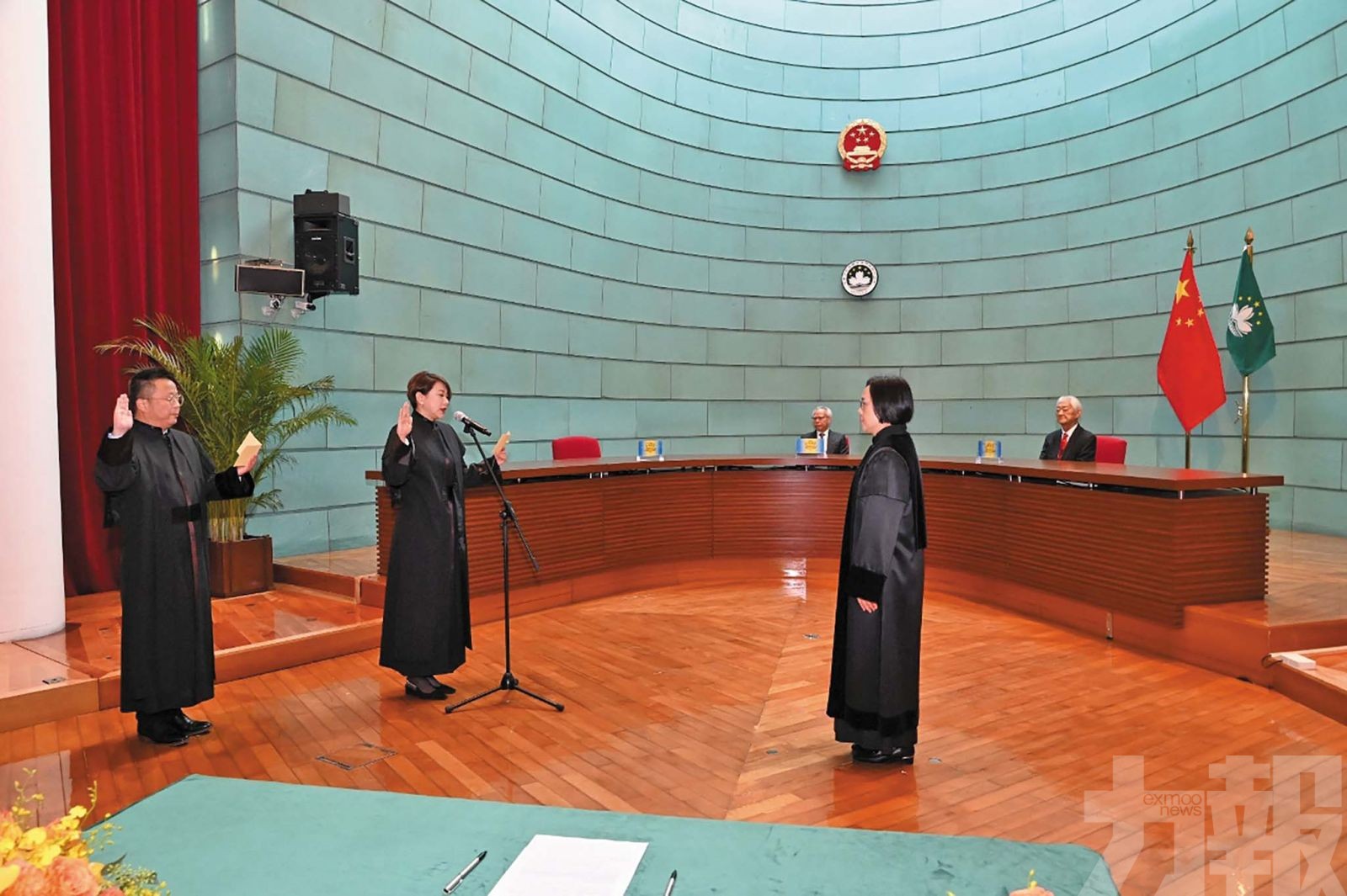 新任第一審法院合議庭主席姚頴珊法官及戎奇法官在終審法院院長監誓下宣誓就職。(終審法院院長辦公室圖片)
