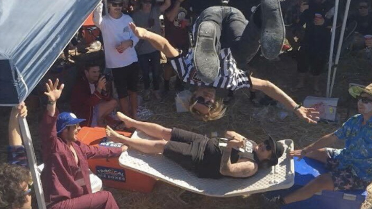 據外媒報道,澳洲近期流行一種驚險刺激的「人體破枱遊戲」,遊戲玩家不顧生命安全,從各種匪夷所思的高處跳下,用自己的身體將地上的桌子狠狠砸碎。