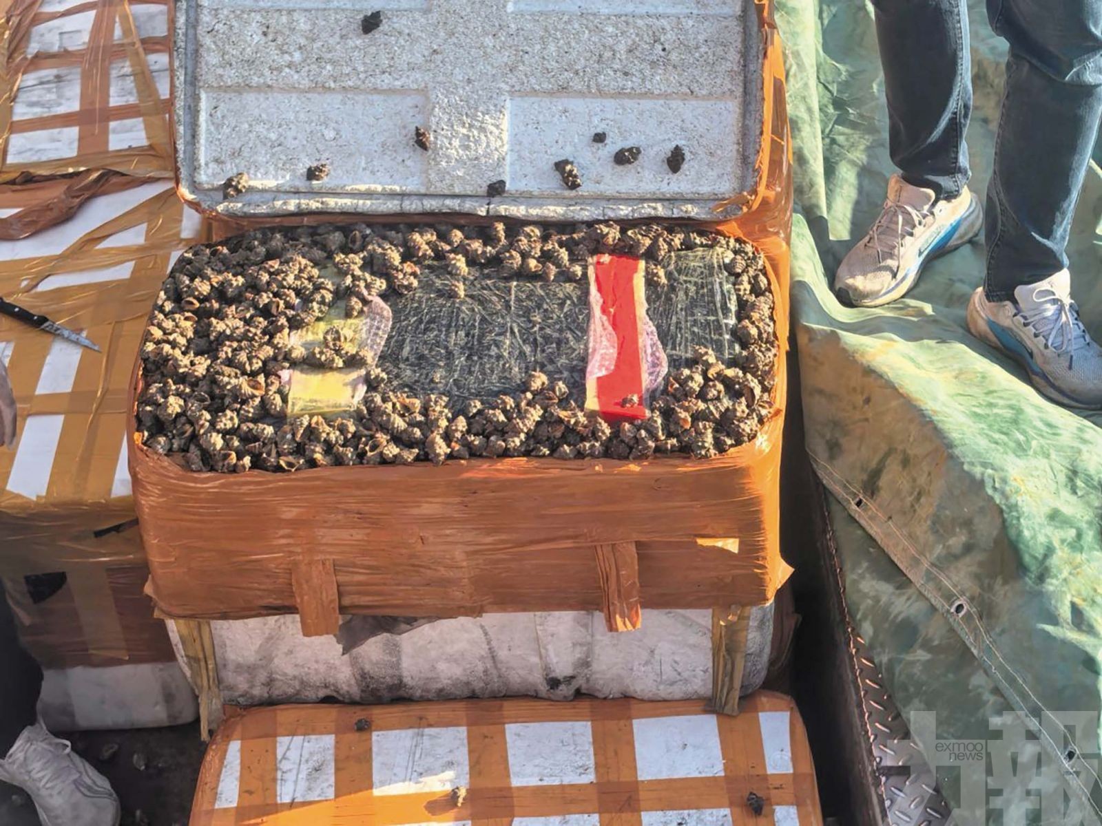 海警執法員查獲夾藏涉嫌走私貨物的漁獲泡沫箱。(觀海融媒圖片)