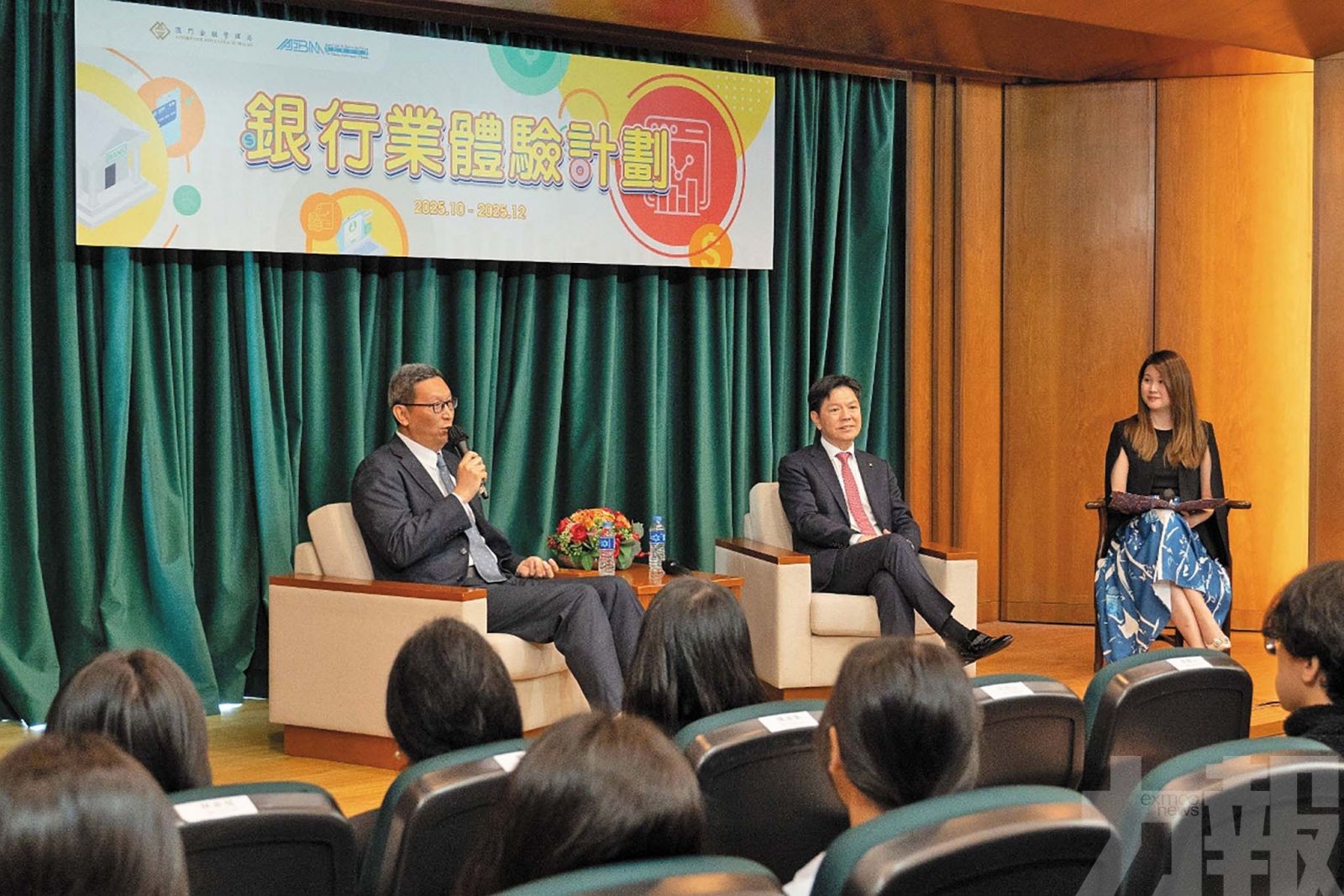 金管局行政管理委員會代主席黃善文及澳門銀行公會主席葉兆佳,在「 銀行業體驗計劃 」首週的「 金融大師班 」上與學生交流互動。 (金管局圖片)