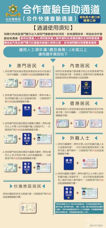 基於橫琴口岸相關措施運行順暢,有助外籍人員跨區流動,澳珠邊檢部門經協商一致,決定自2026年1月26日起,將該措施擴展至港珠澳大橋珠澳口岸的「合作查驗自助通關通道」,適用於上述同類外國護照持用人。