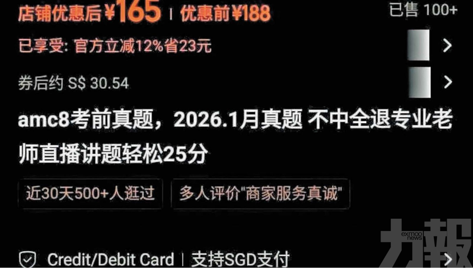 被不少家長視為名校升學「敲門磚」的美國數學能力測試(AMC 8),今年再度爆出疑似洩題風波。新加坡媒體報道,今年考試首日,內地多個電商平台已有人公然販售當年度AMC 8試題及標準答案,甚至提供即時解題服務,事件引發考試公平爭議,新加坡考區主辦方被迫準備替代試題,供學校自行決定是否更換。