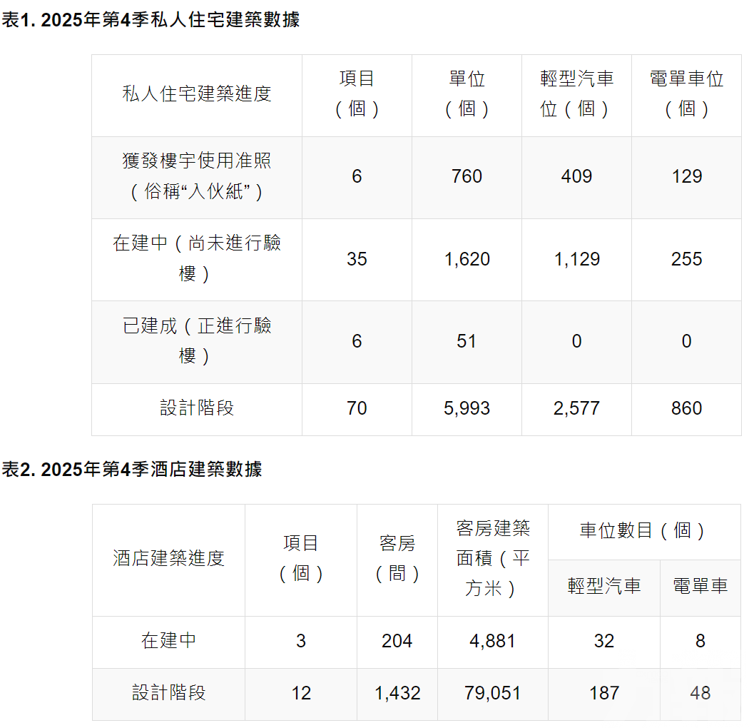 土地工務局公佈最新住宅和酒店項目的建築數據。2025年第4季,獲發樓宇使用准照(俗稱“入伙紙”)的私人住宅項目有6個,提供760個單位;在建中(尚未進行驗樓)及已建成(正進行驗樓)的私人住宅項目有41個,可提供1,671個單位;設計階段住宅項目有70個,可提供5,993個單位。