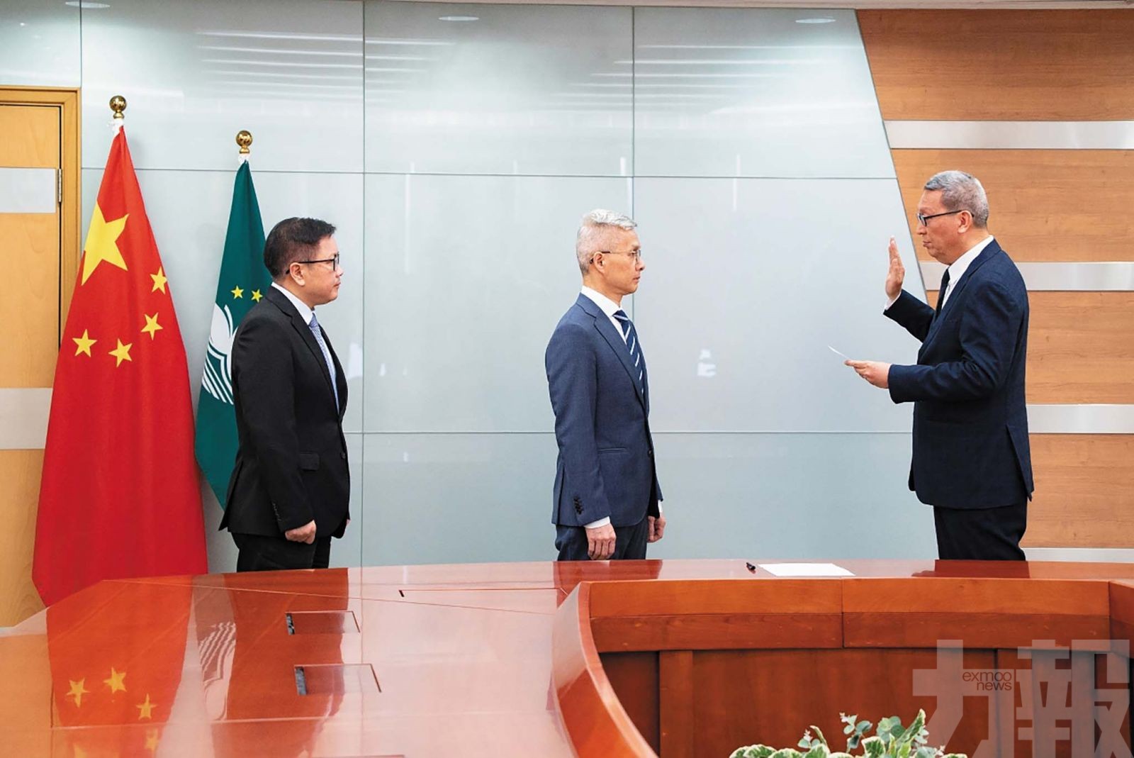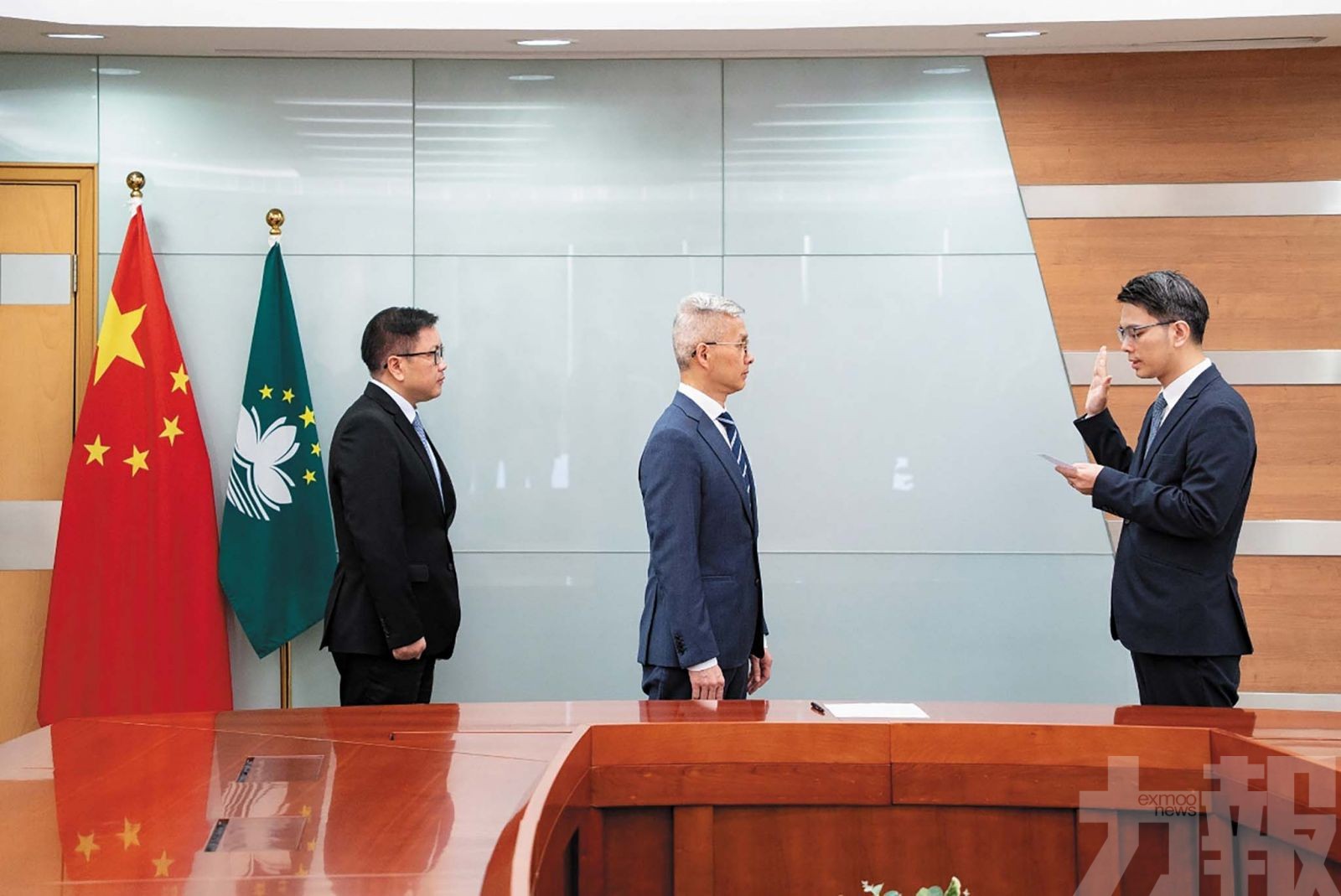 經濟財政司司長戴建業主持澳門金融管理局行政管理委員會主席黃善文及統計暨普查局局長龐啓富就職儀式。(經財司司長辦公室圖片)