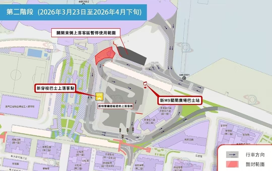 關閘原特警總部大樓上落客區重整已整體完成,經跨部門協調,並綜合評估關閘口岸周邊的行車及乘客集散空間,3月23日(周一)起,將分階段調整綜合度假休閒企業(下稱“休企”)及酒店穿梭巴士的上落客點。