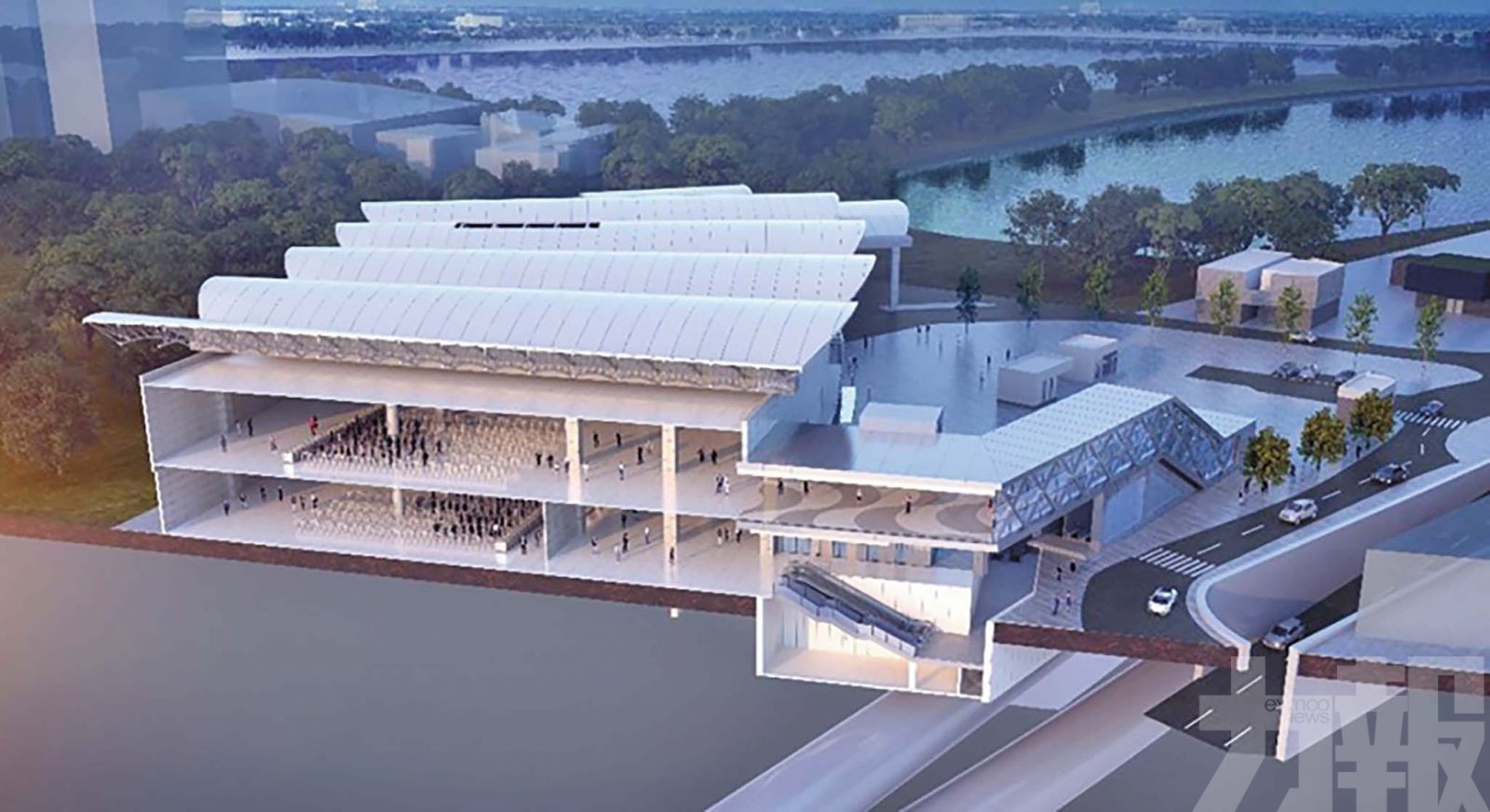 輕軌東線ES1站關閘邊檢大樓連接通道效果圖。(公共建設局圖片)