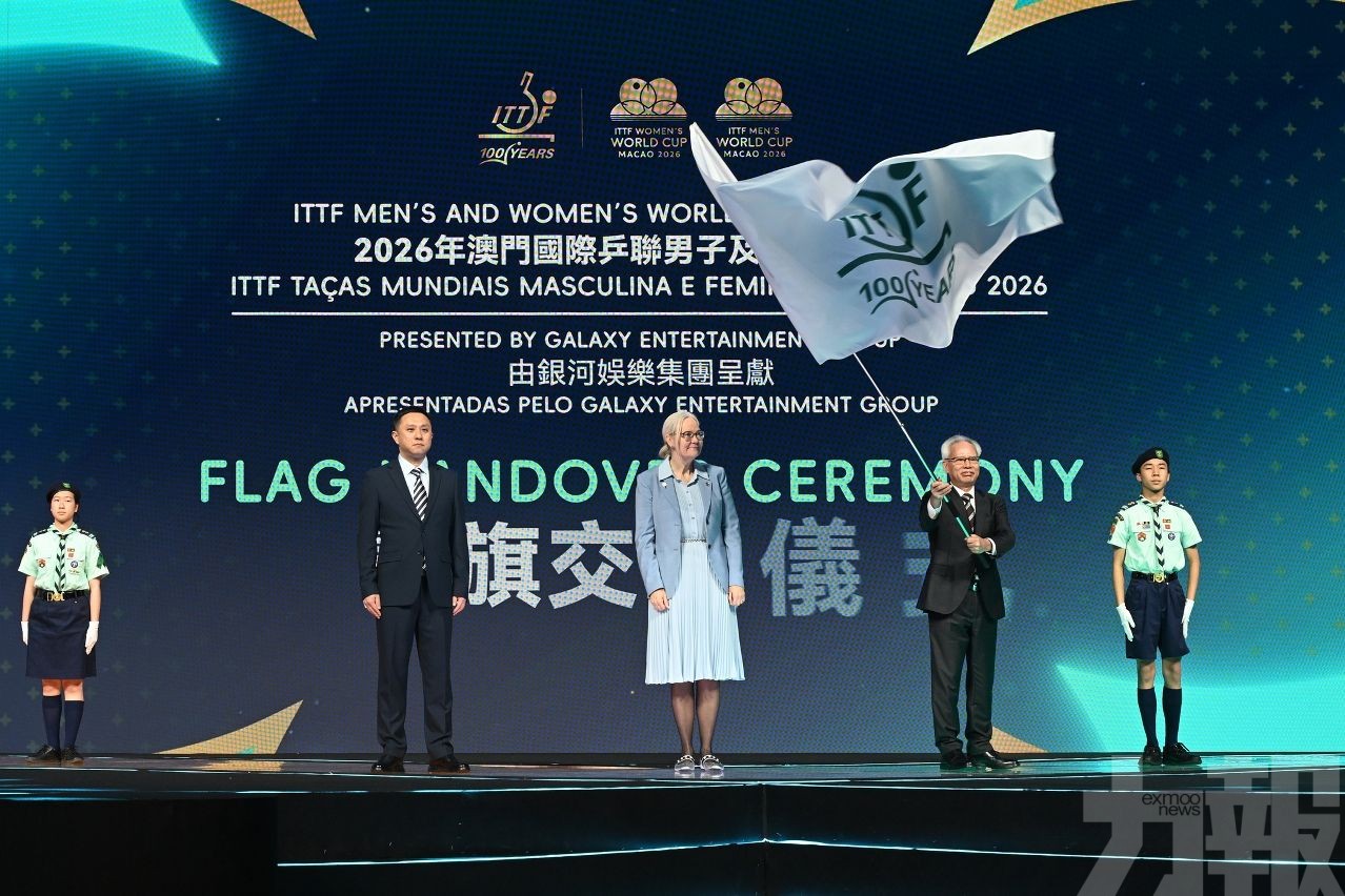 行政長官岑浩輝將2026年澳門國際乒聯男子及女子世界盃賽旗交予國際乒聯代表。