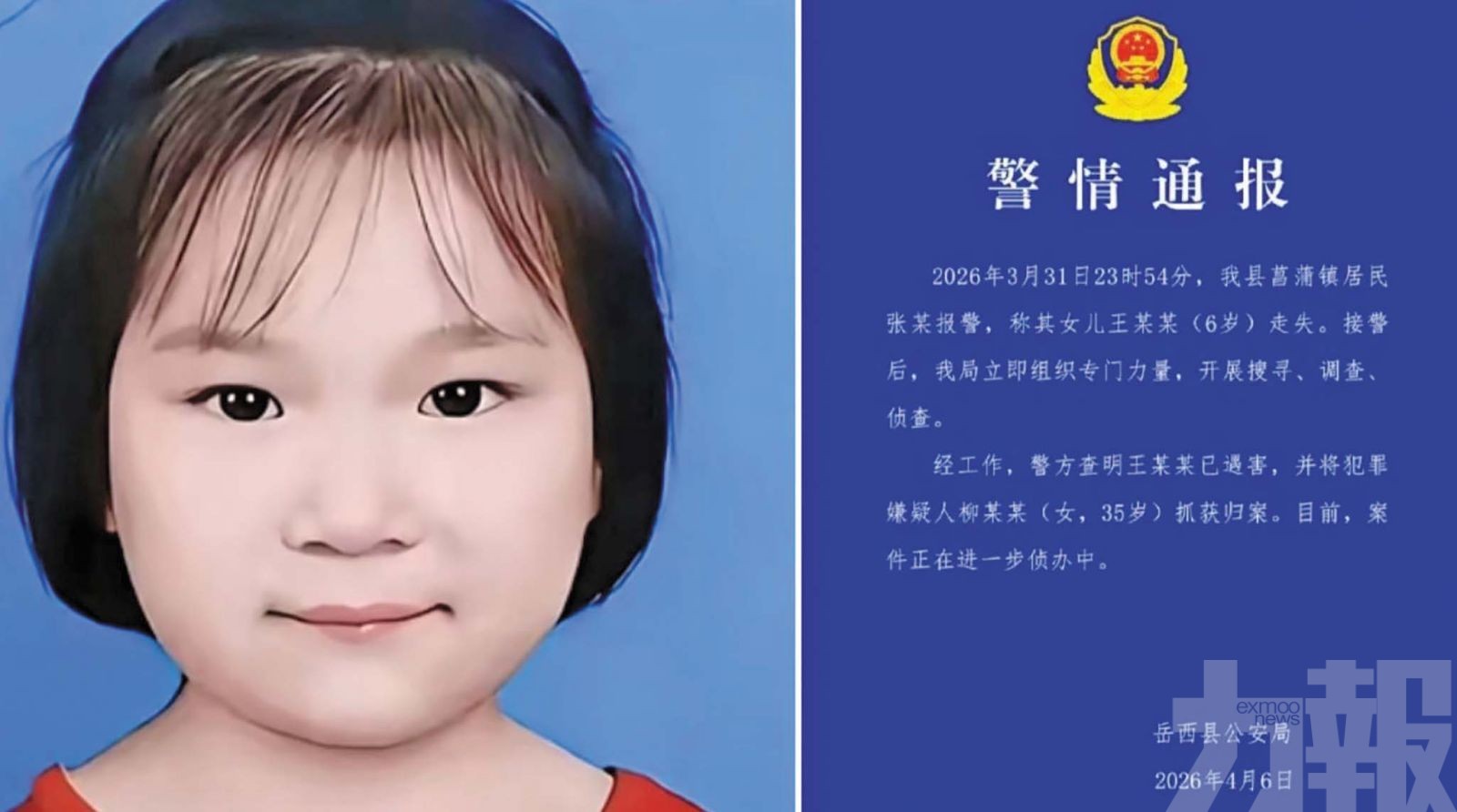 安徽省安慶市岳西縣一宗女童失蹤案有新進展。警方6日通報,3月31日失蹤的6歲女童王張佩已不幸遇害,涉案35歲女子柳某某已被抓獲歸案。