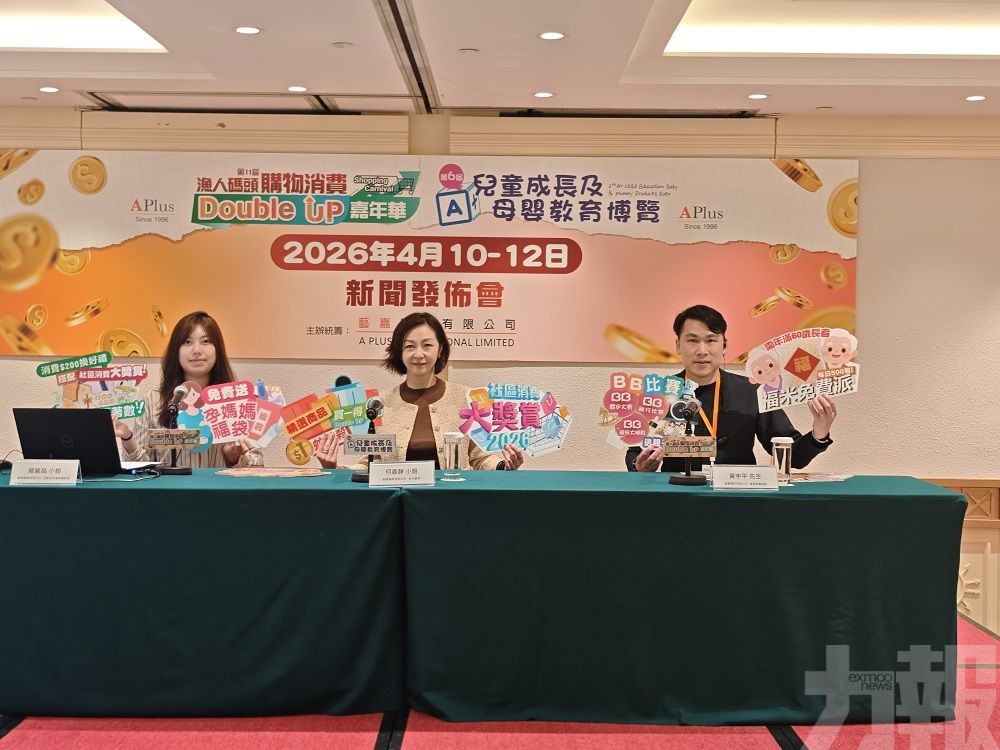 由藝嘉國際有限公司主辦的「第11屆漁人碼頭購物消費Double Up嘉年華」及「第6屆A+兒童成長及母嬰教育博覽」,將於2026年4月10日至12日在澳門漁人碼頭會議展覽中心隆重舉行。今屆雙展以「親子童樂・春日消費新體驗」為主題,匯聚近百家家本地、香港及台灣地區優質展商,設立超過150個展位,涵蓋兒童教育、母嬰護理、家居生活等一站式家庭體驗。展會首日適逢特區政府「2026社區消費大獎賞」活動啟動,市民於展場消費可同時享受政府電子優惠及展會獨家促銷,共享雙重消費利好。