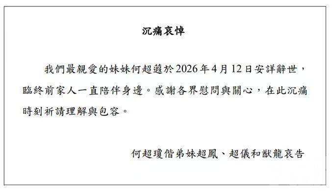 通告以何超瓊、何超鳳、何超儀和何猷龍署名,指「我們最親愛的妹妹何超遊於2026年4月12日安詳辭世」,臨終前家人一直陪伴身邊,感謝各界慰問與關心,並指在此沉痛時刻祈請理解與包容。