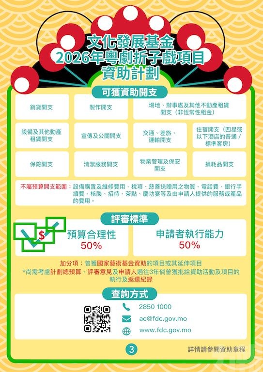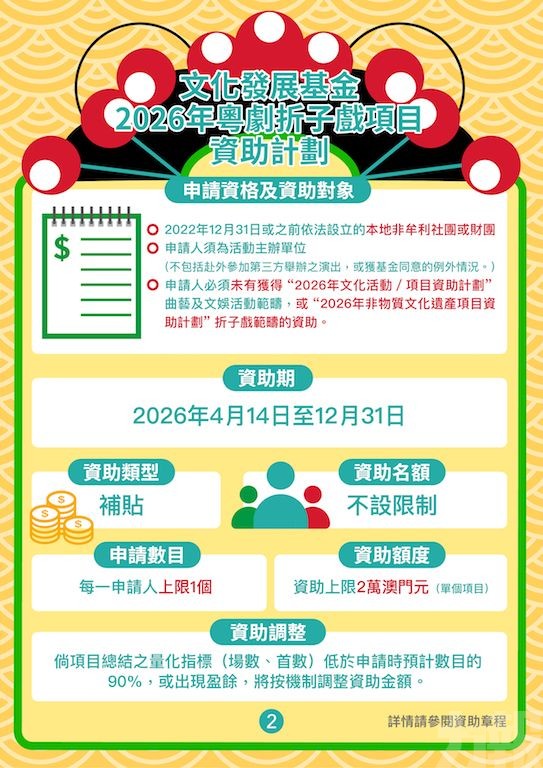 凡在本澳註冊的非牟利社團或財團均可提出申請,項目須為公開舉辦、供公眾參與,且整個演出內容均為粵劇折子戲。申請人須為活動主辦單位,並且未曾獲“2026年文化活動/項目資助計劃”曲藝及文娛活動範疇,或“2026年非物質文化遺產項目資助計劃”折子戲範疇的資助。