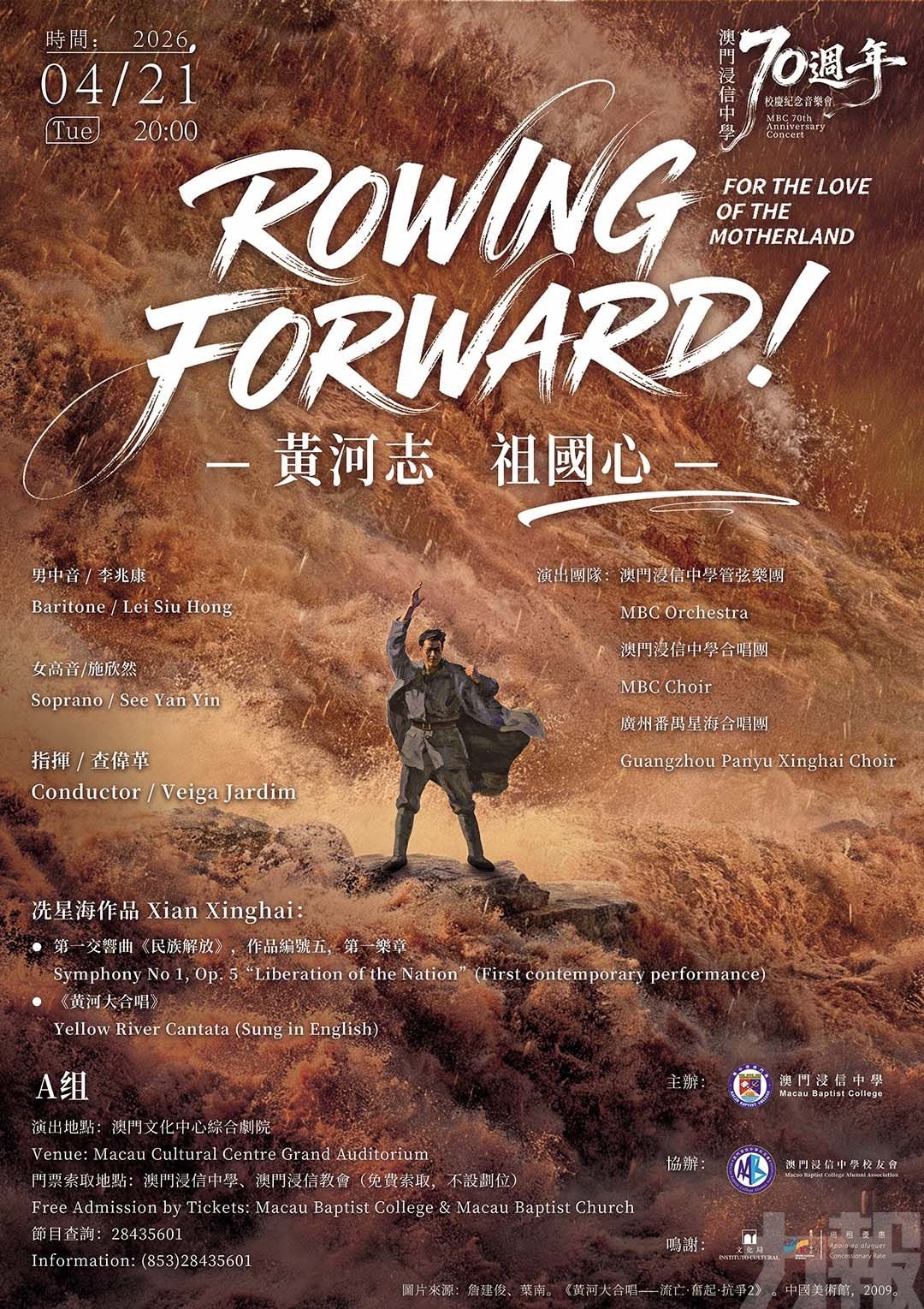 本場音樂會以澳門浸信中學建校70週年校慶為契機,聚焦民族音樂的經典傳承,呈獻冼星海作品中最具辨識度與深刻意涵的篇章。音樂會將演出冼星海的《黃河大合唱》,並特別呈現其鮮少演出的第一號交響曲《民族解放》(作品5號)第一樂章。主辦方表示,兩部作品分別以宏闊的大眾合唱敘事、與交響樂的深層隱喻思維交織,讓觀眾在音樂中感受共同的歷史記憶與文化認同,亦將「祖國的呼喚」化為可被聆聽、可被共鳴的情感力量。