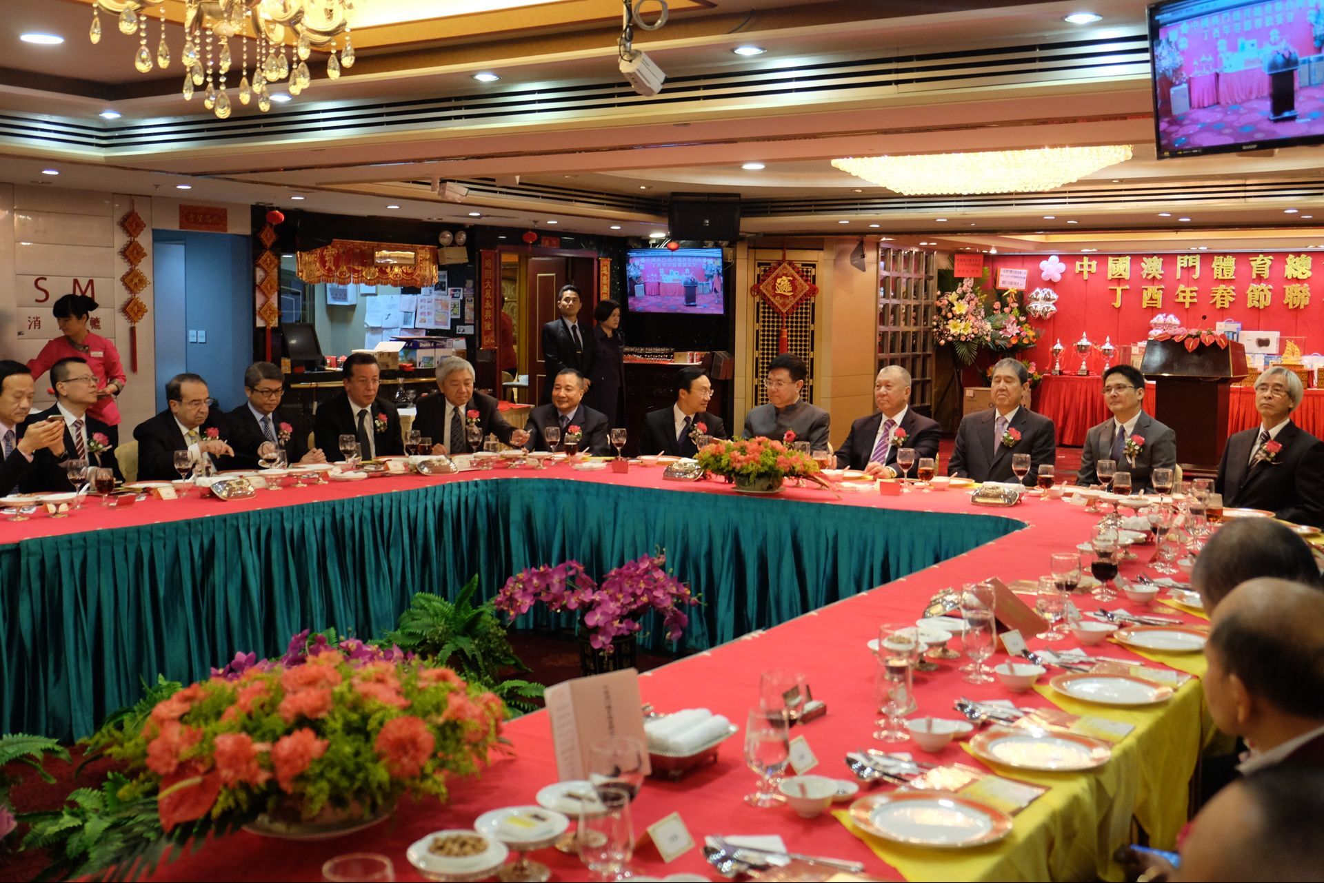 中國澳門體育總會聯合會今(21日)晚在聯邦大酒樓舉行丁酉年春節聯歡宴會,邀請到全國政協副主席何厚鏵、中聯辦副主任薛曉峰、社會文化司司長譚俊榮、外交公署綜合部主任張堅等嘉賓 出席。晚宴同時邀請全澳體育界及各界人士出席,出席人數達1,000人。