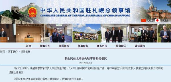 中國駐札幌總領事館官網今日(30日)發布消息,8月30日12時,札幌南警察署負責人通報稱,周日(27日)在釧路市發現的女性屍體,「經DNA鑑定為我失聯公民」,亦即危秋潔,中國駐札幌總領事孫振勇已趕赴釧路市處理。危秋潔的弟弟表示,家屬最快於31日到達日本處理後事。