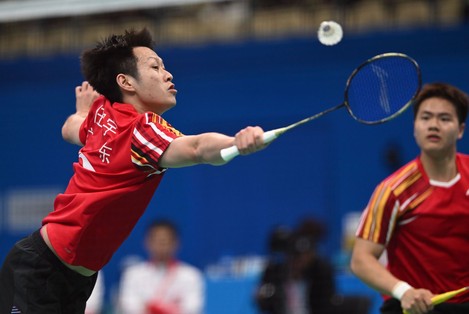 (廣東隊組合梁偉鏗/任翔宇(左)在男雙比賽回球)