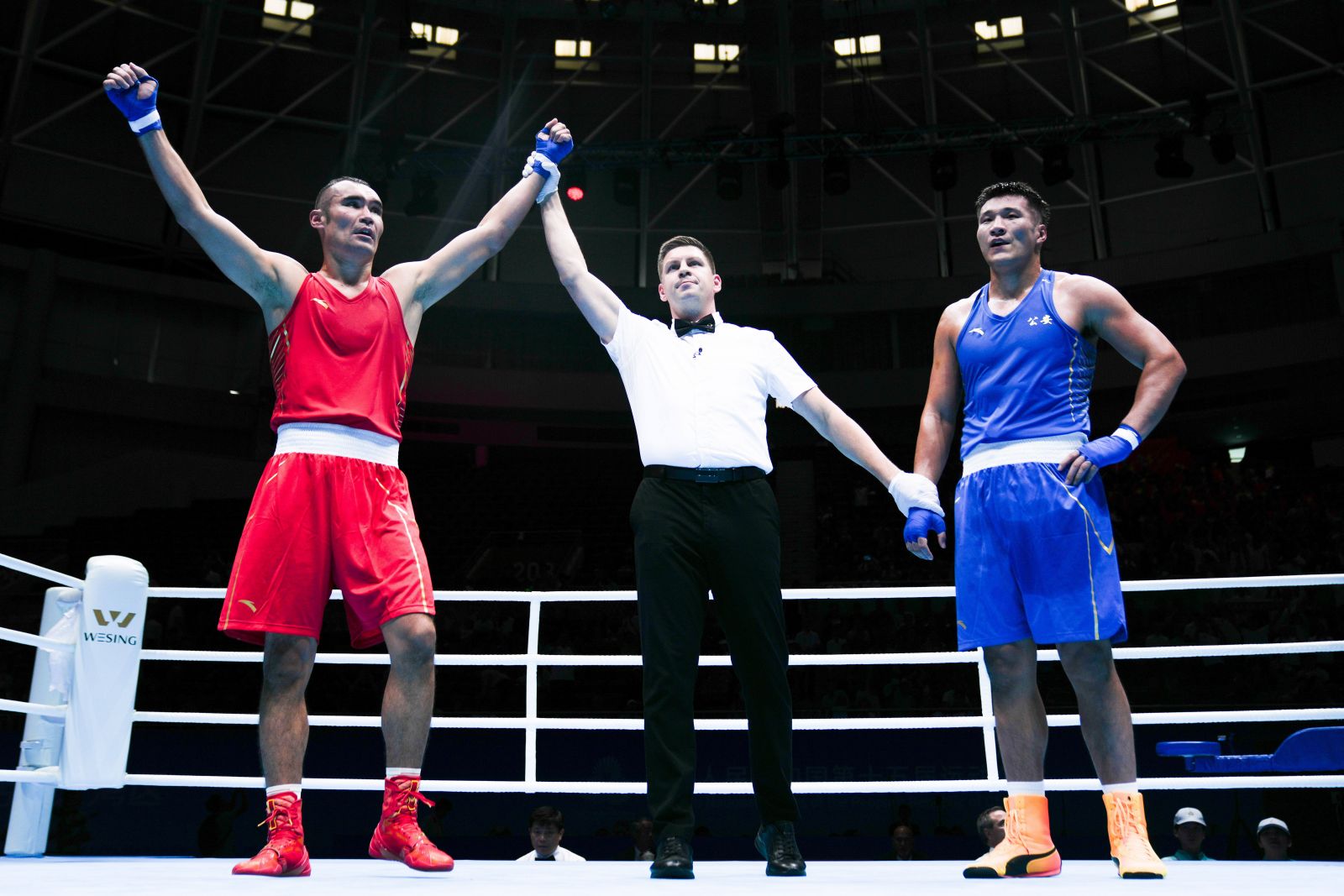 (裁判宣布巴依克吾孜·達那別克(左)在比賽中取得勝利)