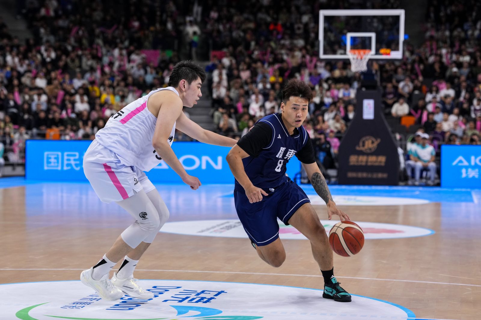 (廣東隊球員趙睿(右)在比賽中突破)